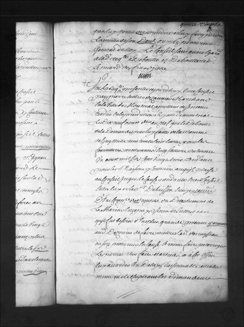 Arrêt qui ordonne de mettre le sieur Desruisseaux en cause dans le procès de Pierre Trottier Desauniers, marchand à Montréal, contre le sieur Dubuisson, capitaine dans les troupes de la Marine, 7 mai 1725, Archives nationales à Québec, Fonds Conseil souverain, (03Q,TP1,S28,P16175).