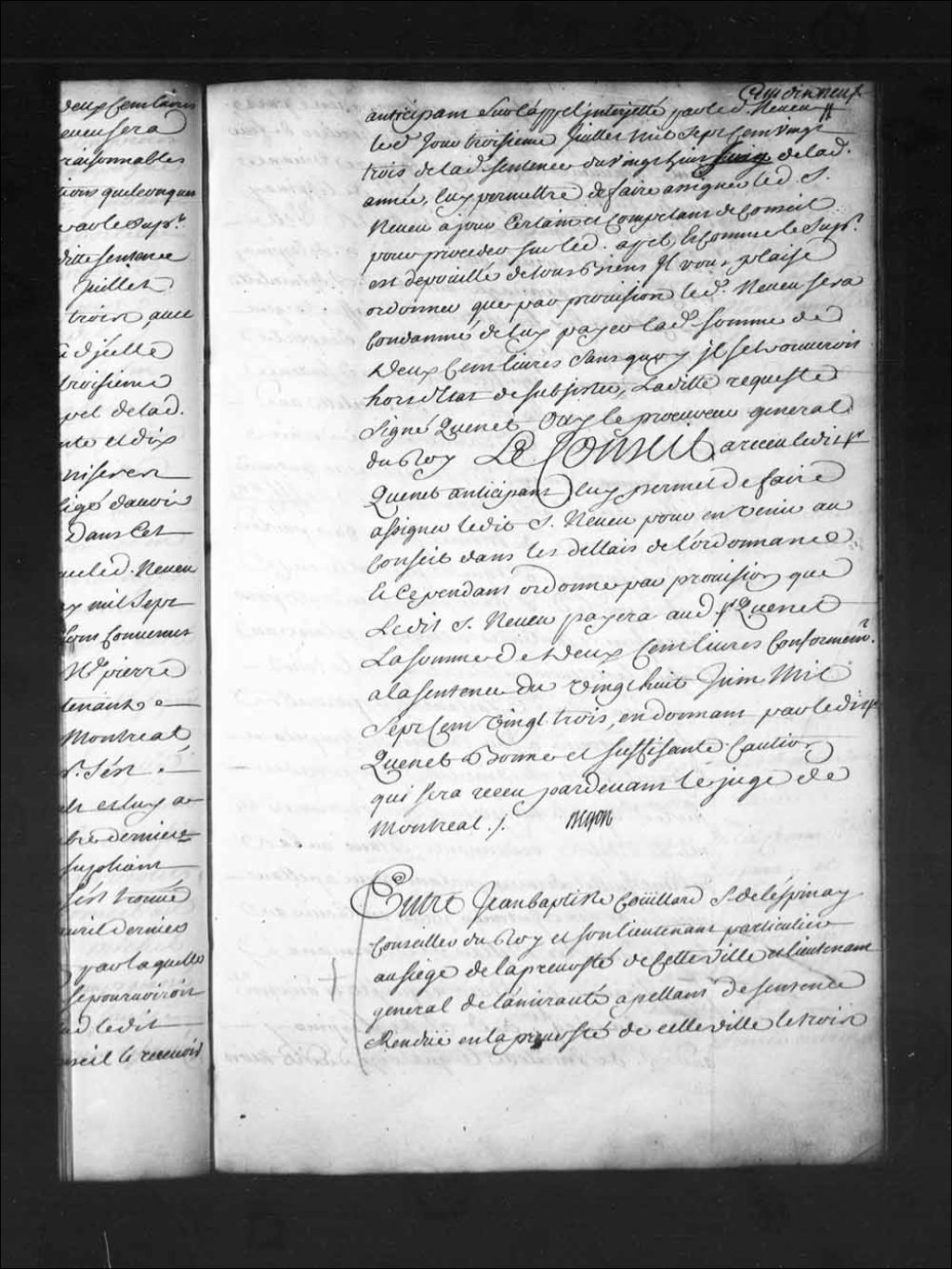 Appel mis à néant de la sentence rendue, le 3 octobre 1724, dans la cause de Jean-Baptiste Couillard de Lespinay contre Joseph Amyot de Vincelotte, héritier de Geneviève de Chavigny, sa mère. Il est ordonné que le sieur de Lespinay gardera les six cuillères, six fourchettes et la tasse d'argent en contestation en remplacement des six cuillères, six fourchettes et de la tasse d'argent que le sieur de Vincelotte a reçue lors de son mariage, 6 août 1725, Archives nationales à Québec, Fonds Conseil souverain, (03Q,TP1,S28,P16217).