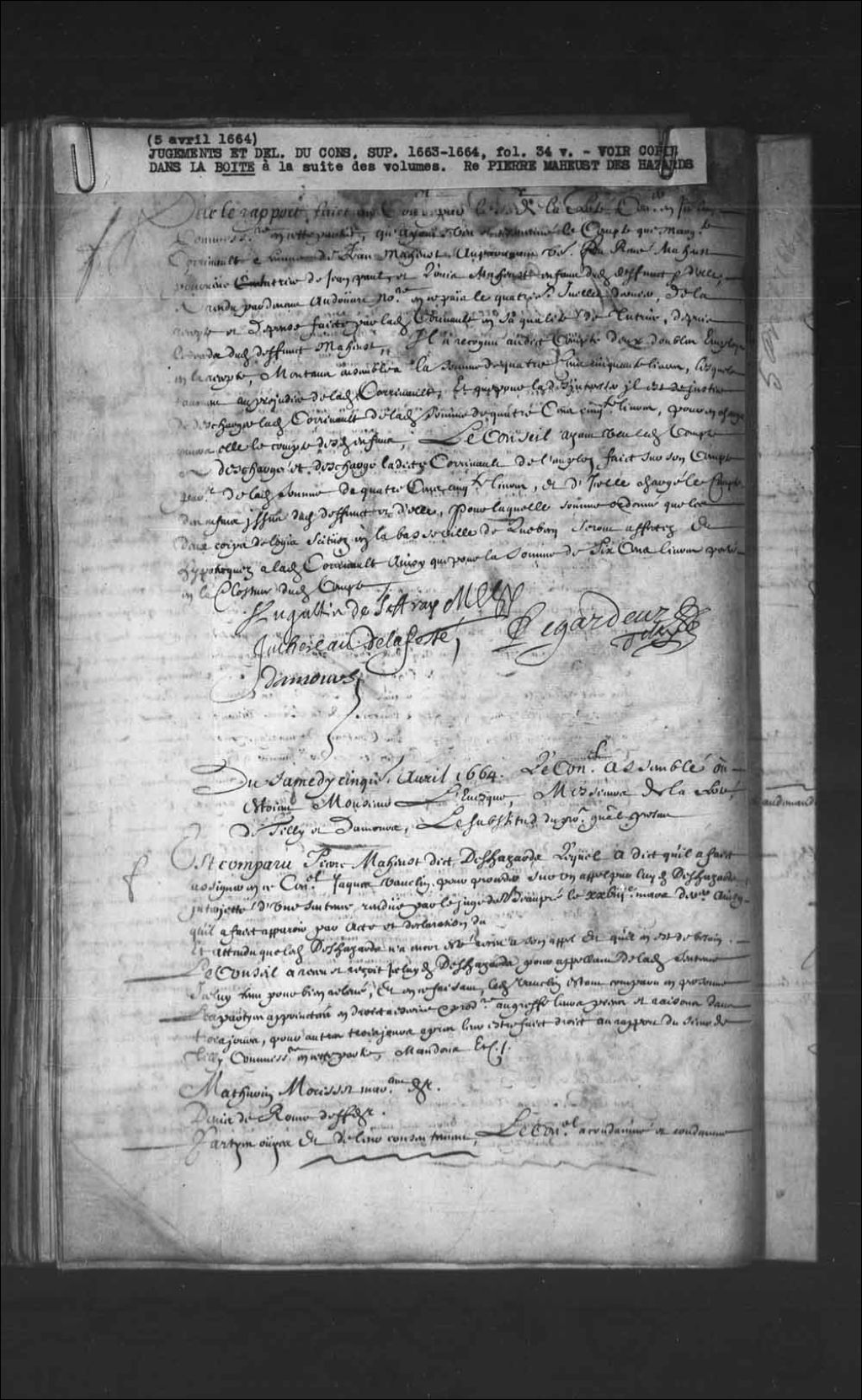 - Transcription du texte avec orthographe modernisée : «Sur le rapport fait au Conseil par le sieur de LaFerté conseiller en icelui, commissaire en cette partie, qu'ayant vu et examiné le compte que Marguerite Corrivault femme de Jean Maheust auparavant veuve de feu René Maheust pourvu tutrice de Jean paul. Et Louis Maheu enfants dudit défunt et d'elle, a rendu par-devant Audouart notaire en ce pays le quatrième juillet dernier, de la recette et dépense faite par ladite Corrivault en sa qualité de tutrice, depuis le décès dudit défunt Maheu, il a reconnu audit compte deux doubles emplois en la recette, montant ensemble à la somme de quatre cent cinquante livres, lesquels tournent au préjudice de ladite Corrivault, et que pour la désintéresser il est de justice de décharger ladite Corrivault de ladite somme de quatre cent cinquante livres, pour en charger envers elle le compte desdits enfants, Le Conseil ayant vu ledit compte a déchargé et décharge ladite Corrivault de l'emploi fait sur son compte particulier de ladite somme de quatre cent cinquante livres, et d'icelle chargé le compte des enfants issus dudit défunt et d'elle, pour laquelle somme ordonné que les deux corps de logis situés en la basse-ville de Québec seront affectés et hypothéqués à ladite Corrivault ainsi que pour la somme de six cents livres portée en la clôture dudit compte. AUGUSTIN DE SAFFRAY MESY JUCHEREAU DE LAFERTÉ, LEGARDEUR DE TILLYDAMOURS.»