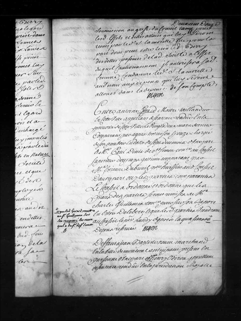 Arrêt qui ordonne aux parties de remettre leurs pièces à Charles Guillimin, conseiller, dans la cause d'Antoine Girard, maître taillandier à Québec, comparant par Agnès Trottier, sa femme, contre Paul Denys de Saint-Simon, conseiller au Conseil Supérieur, 15 avril 1726, Archives nationales à Québec, Fonds Conseil souverain, (03Q,TP1,S28,P16324).
