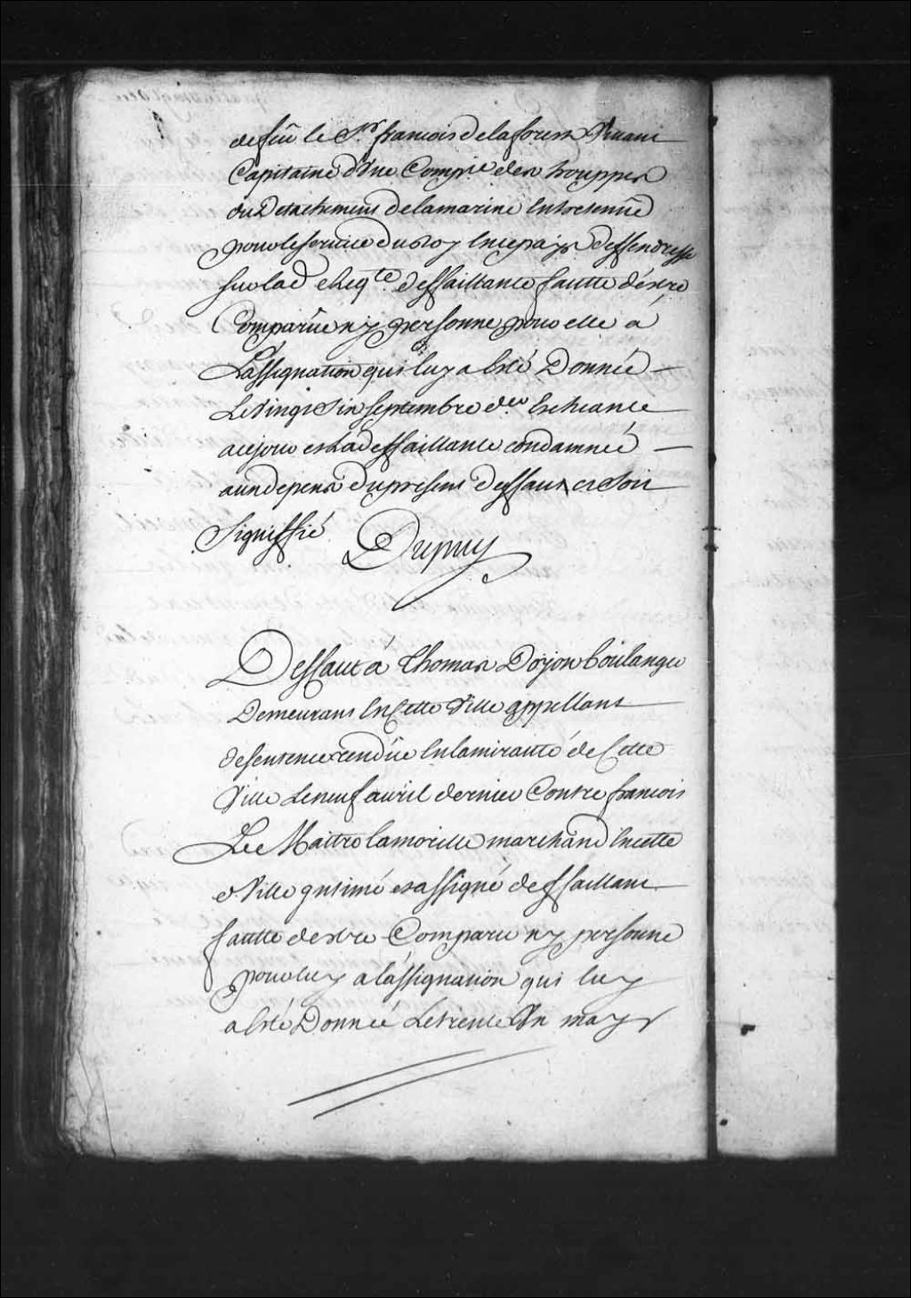 Défaut à Thomas Doyon, boulanger de Québec, contre François Lemaître Lamorille, marchand à Québec