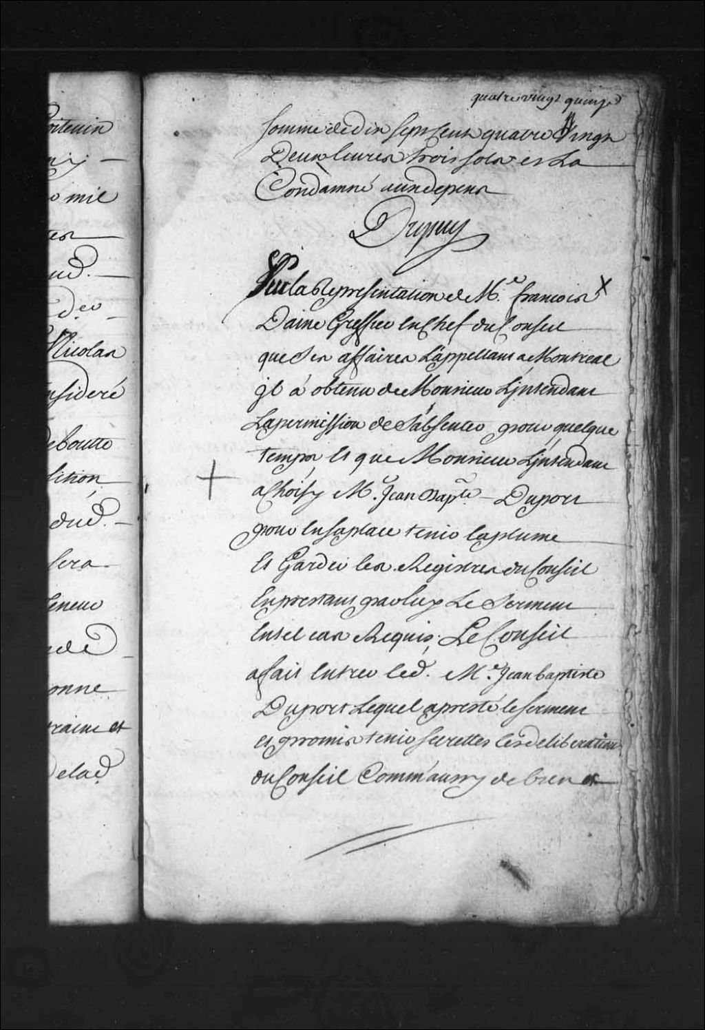 Le Conseil fait entrer Jean-Baptiste Duport et lui fait prêter le serment de tenir secrètes les délibérations du Conseil comme aussi de bien et fidèlement se comporter en tout ce qui regarde les fonctions de greffier du Conseil pendant le temps qu'il va les remplir en remplacement de François Daine que ses affaires appellent à Montréal et qui a obtenu de l'intendant la permission de s'absenter pour quelque temps