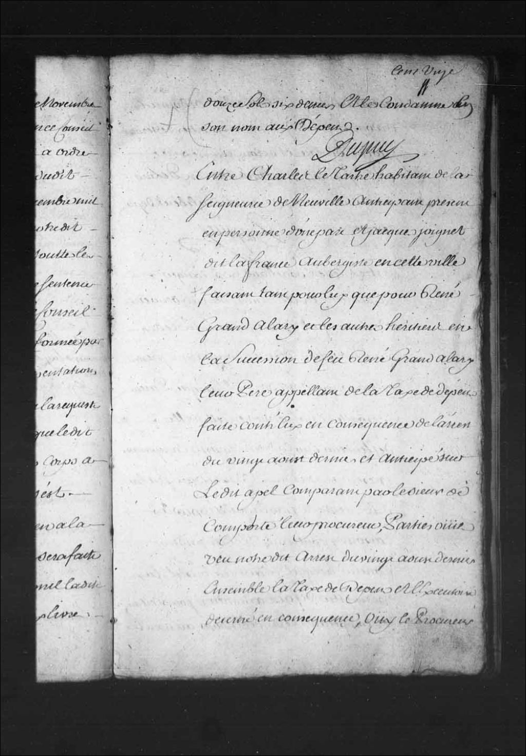 Arrêt qui ordonne que dans la cause de Charles Letarte, habitant de la seigneurie de Neuville, contre Jacques Joignet dit Lafrance, aubergiste, faisant tant pour lui que pour René Grand-Alary et les autres héritiers de feu René Grand-Alary, leur père, les pièces des parties resteront sur le bureau et seront remises à François-Mathieu Martin de Lino pour en être délibéré dans son rapport, 2 décembre 1726, Archives nationales à Québec, Fonds Conseil souverain, (03Q,TP1,S28,P16417).