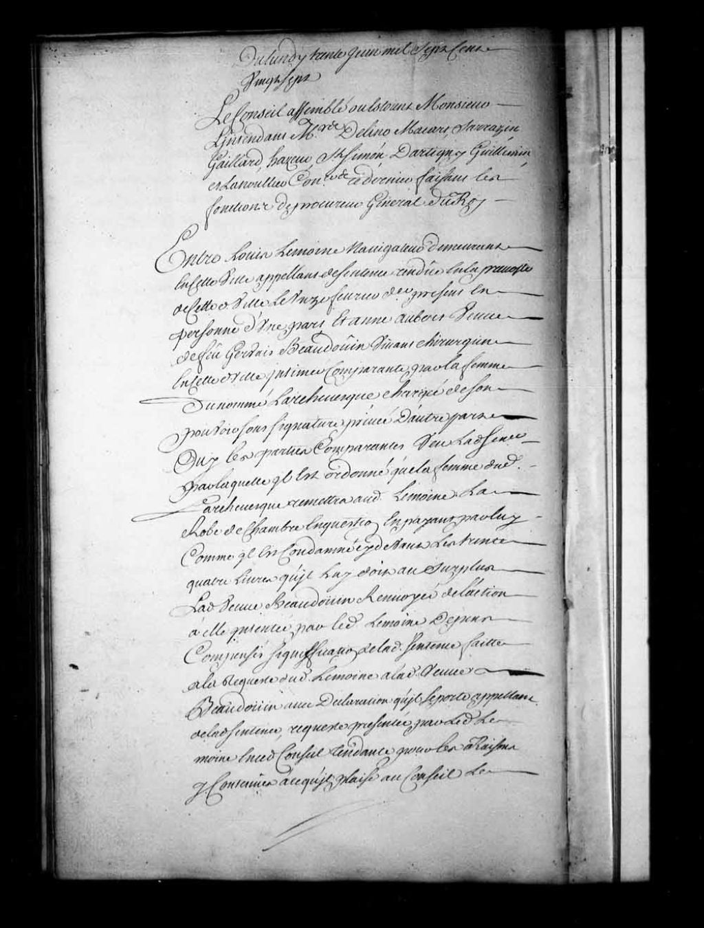 Appel mis à néant de la sentence rendue le 11 février 1727, dans la cause de Louis Lemoine, navigateur, contre Anne Aubert, veuve de Gervais Beaudoin, chirurgien. Il est ordonné que la veuve Beaudoin remettra au sieur Lemoine la robe de chambre en contestation et si la dite veuve Beaudoin préfère recevoir la valeur de la robe de chambre à raison de 70 livres, 30 juin 1727, Archives nationales à Québec, Fonds Conseil souverain, (03Q,TP1,S28,P16505).