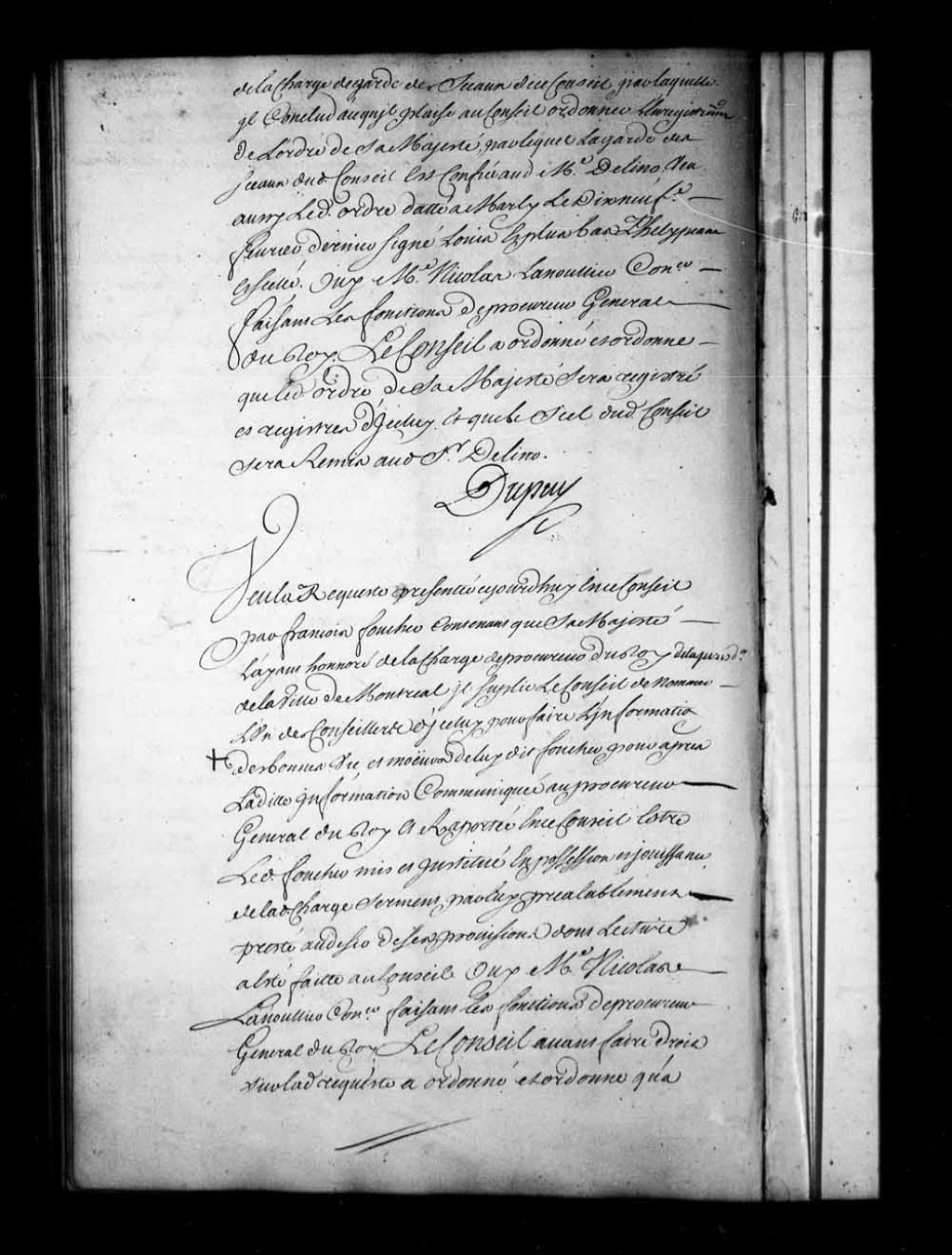 Arrêt qui ordonne de faire information des vie, moeurs, âge compétent, conversation et religion catholique, apostolique et romaine de François Foucher honoré de la charge de procureur du Roi de la Juridiction de la ville de Montréal, 6 septembre 1727, Archives nationales à Québec, Fonds Conseil souverain, (03Q,TP1,S28,P16535).