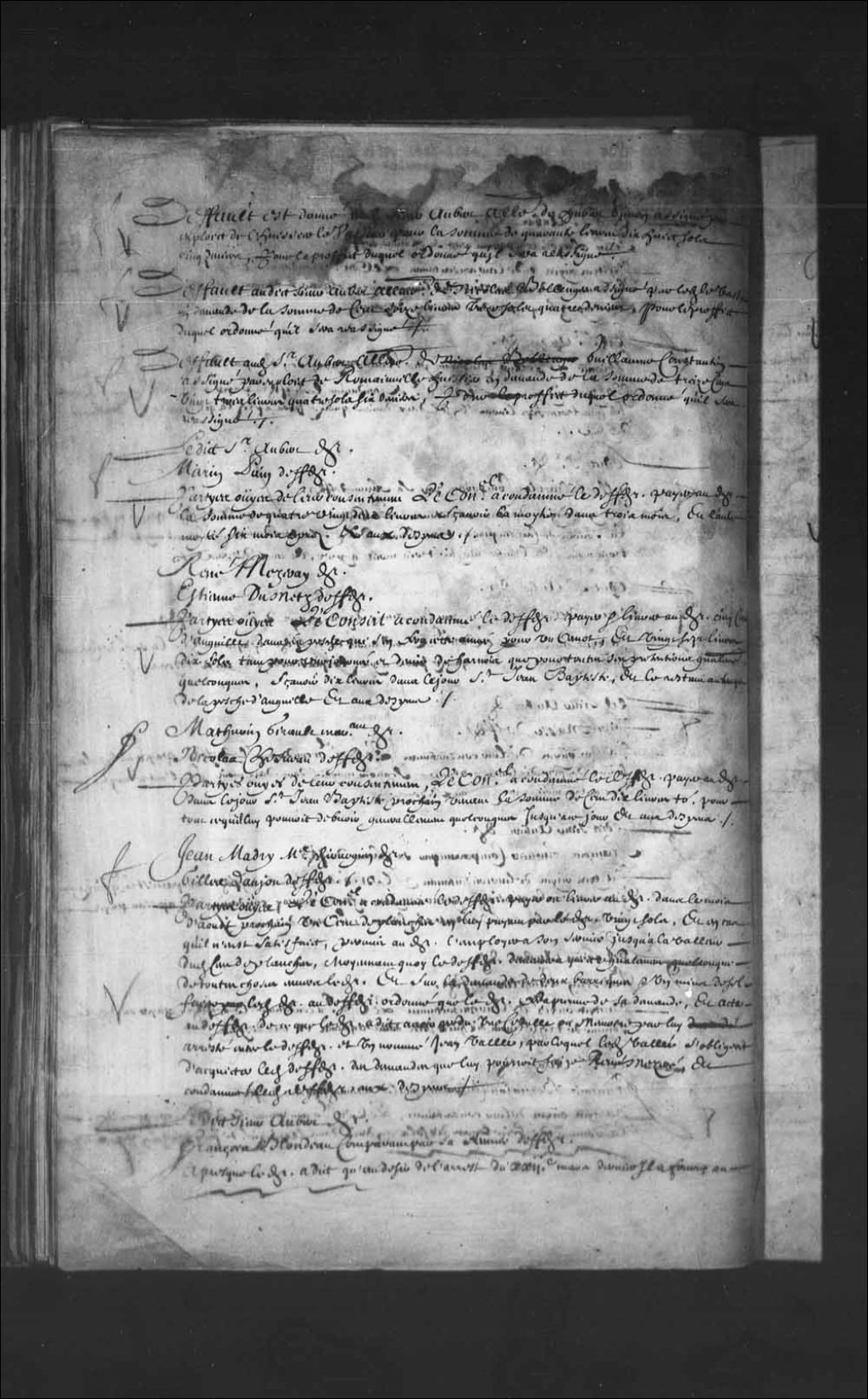 Transcription du texte avec orthographe modernisée : «Jean Madry maître chirurgien demandeur. Gilles DANJOU défendeur. Parties ouïes, le Conseil a condamné le défendeur payer ou livrer au demandeur dans le mois d'août prochain un cent de planches en lui payant par le demandeur vingt sols. Et en cas qu'il n'eût satisfait, permis au demandeur l'employer à son service jusqu'à la valeur dudit cent de planches, moyennant quoi le défendeur demeurera quitte généralement quelconque de toutes choses envers le demandeur. Et sur la demande de deux barriques et un minot de sel faite par ledit demandeur au défendeur ordonné que le demandeur fera preuve de sa demande, et acte au défendeur de ce que le demandeur a dit avoir perdu une cédule ou mémoire par lui arrêté entre le défendeur et un nommé Jean Vallée, par lequel ledit Vallée s'obligeait d'acquitter ledit défendeur des demandes que lui pourrait faire René Mezeré, et condamné ledit défendeur aux
