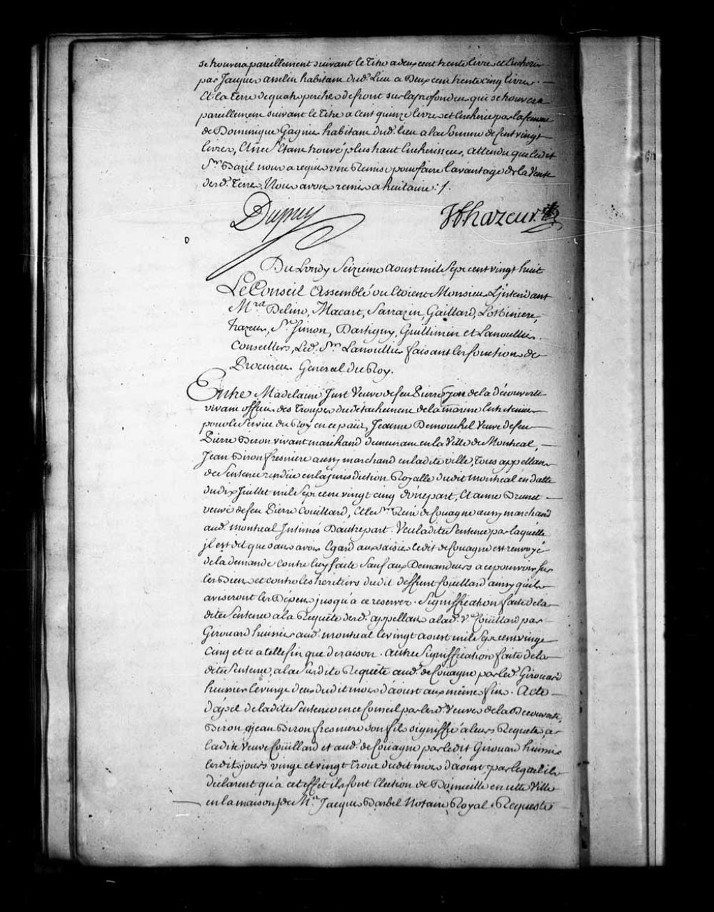 Appel mis à néant de la sentence rendue en la Juridiction de Montréal, le 10 juillet 1725, dans la cause de Madeleine Just, veuve de Pierre You de la Découverte, officier des troupes, Jeanne Dumouchel, veuve de Pierre Biron, marchand de Montréal, et de Jean Biron Fresnière, aussi marchand de Montréal, contre Anne Brunet, veuve de Pierre Couillard, et de René de Couagne, marchand. Adhémar, notaire royal à Montréal, est sommé de comparaître devant le Conseil