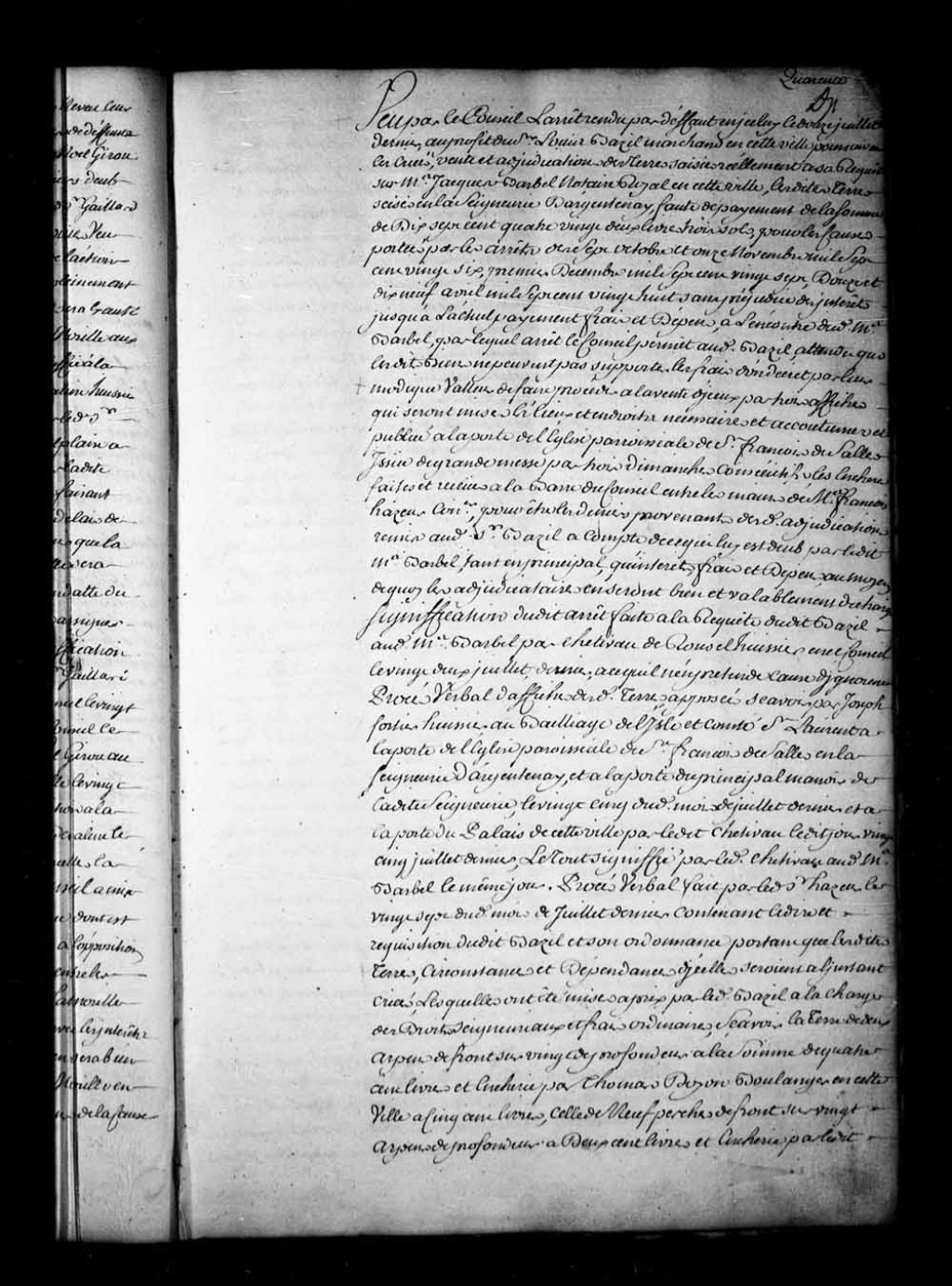 Adjudication des terres, appartenant à Jacques Barbel, situées dans la seigneurie d'Argentenay, saisies au profit de Louis Bazil: terre de deux arpents de front adjugée pour la somme de 600 livres à Henri Hiché; terre de neuf perches de front adjugée pour la somme de 250 livres à Henri Hiché; terre de quatre perches de front adjugée pour la somme de 145 livres au même Henri Hiché, le tout à la charge des droits seigneuriaux et des frais ordinaires. Le dit Henri Hiché dépose en même temps le pouvoir des Soeurs de l'Hôtel-Dieu pour faire l'achat des terres en question