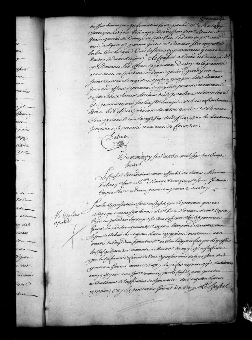 Arrêt qui nomme Paul Denys de Saint-Simon et Jean Crespin (Crépin), conseiller, pour procéder avec le procureur général du Roi au récolement et vérification des registres, livres et papiers remis par M. Dupuy et lui en donner décharge, 6 octobre 1728, Archives nationales à Québec, Fonds Conseil souverain, (03Q,TP1,S28,P16724).