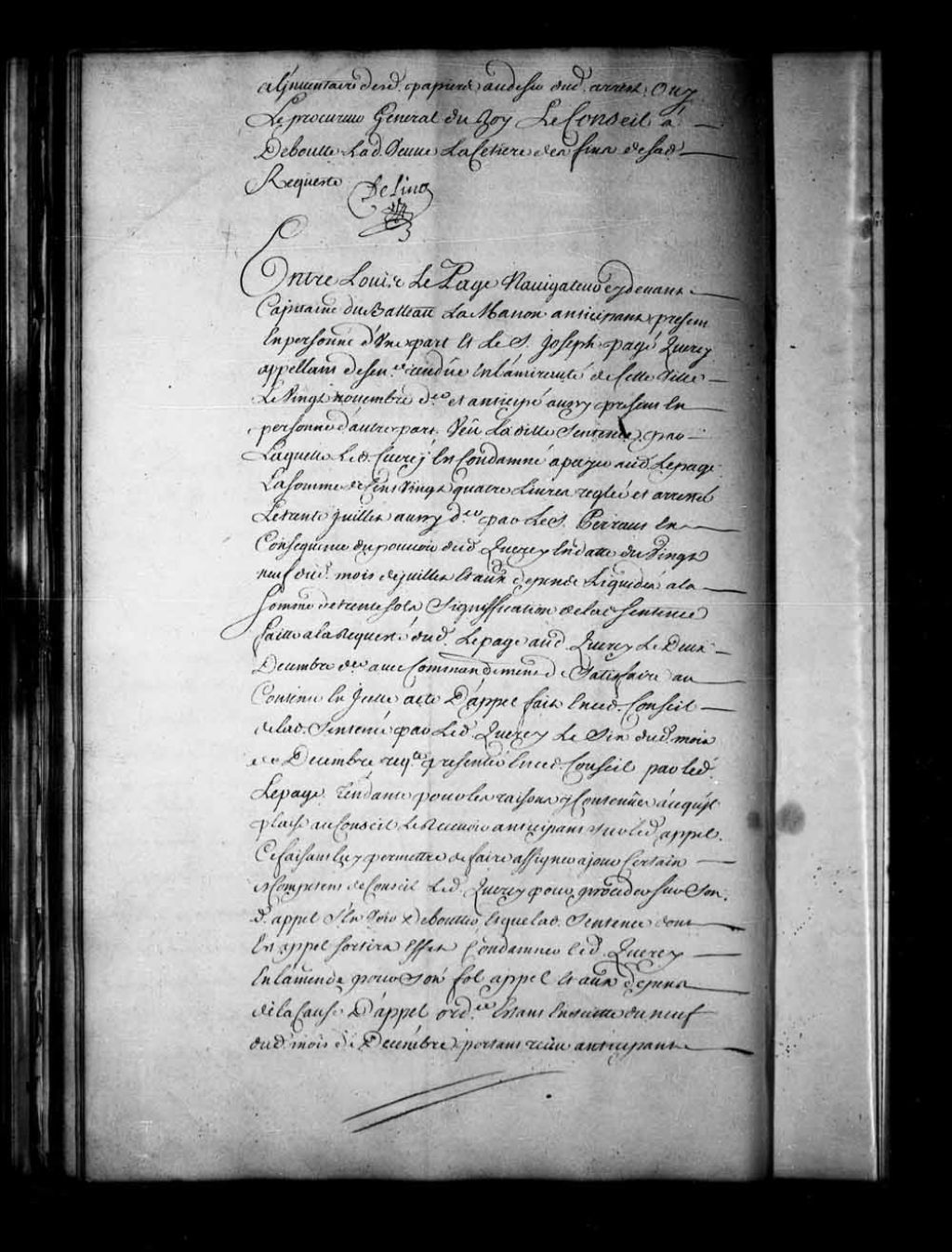 Appel mis à néant de la sentence rendue en l'Amirauté de Québec, le 20 novembre 1728, dans la cause de Louis Lepage, navigateur, capitaine du bateau la Manon, contre Joseph Pagé Quercy. La dite sentence sortira son plein et entier effet et Pagé Quercy est condamné à l'amende de trois livres pour son «fol appel», 10 janvier 1729, Archives nationales à Québec, Fonds Conseil souverain, (03Q,TP1,S28,P16764).