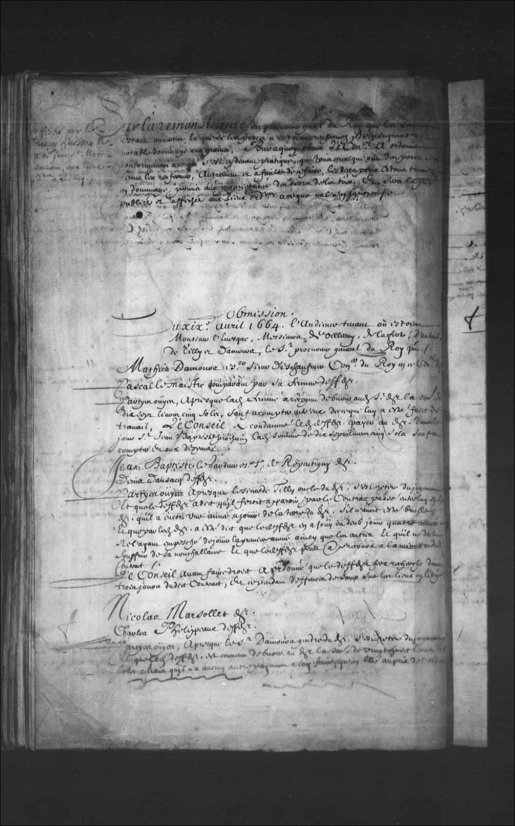 Transcription du texte avec orthographe modernisée : «Jean-Baptiste LEGARDEUR écuyer sieur de Repentigny demandeur. Denis DAUSAC défendeur. Parties ouïes après que le sieur de Tilly oncle du demandeur s'est retiré du jugement, et que le défendeur a dit qu'il ferait apparaître par la contrat passé entre lui et le demandeur qu'il a encore une année à jouir de la terre du demandeur s'il n'avait été brûlé, et que par ledit demandeur a été dit que le défendeur en a joui ou dû jouir quatre années ne l'ayant empêché de jouir la première année ainsi que les autres et qu'il ne doit souffrir de sa nonchalance et que le défendeur peut avoir recours à la minute dudit contrat. Le Conseil avant faire droit a ordonné que le défendeur fera recherche dans trois jours dudit contrat, et cependant défense de semer sur les lieux en litige.»