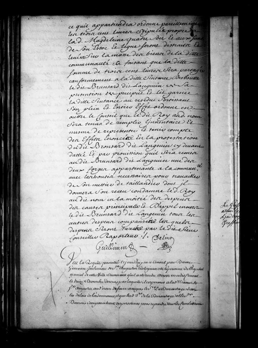 Arrêt qui permet au sieur Gagnon, capitaine de milice de la seigneurie de la Bouteillerie, de notifier aux sieurs de la Durantaye père et fils et au sieur Damours, l'arrêt du 13 décembre 1728 dans leur cause avec la Mère Geneviève Juchereau de Saint-Augustin, religieuse et supérieure de l'Hôpital général de Québec, 8 mars 1729, Archives nationales à Québec, Fonds Conseil souverain, (03Q,TP1,S28,P16799).