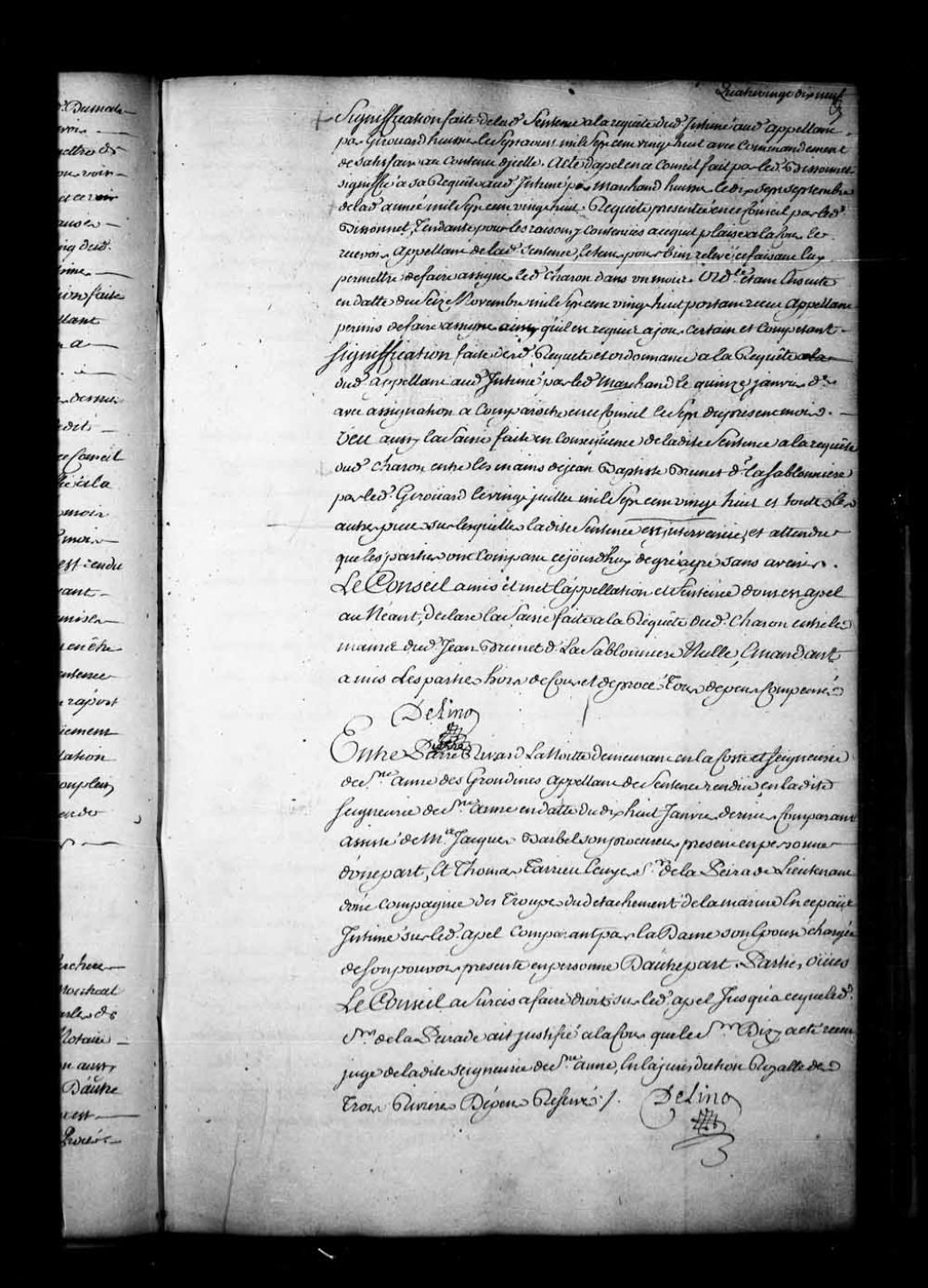 Arrêt qui sursit à faire droit sur l'appel de Pierre Rivard Lanouette d'une sentence rendue en la seigneurie de Sainte-Anne (Ste-Anne), en date du 18 janvier 1729. La dite sentence rendue en faveur de Thomas Tarieu de la Pérade, seigneur en partie de Sainte-Anne (Ste-Anne)