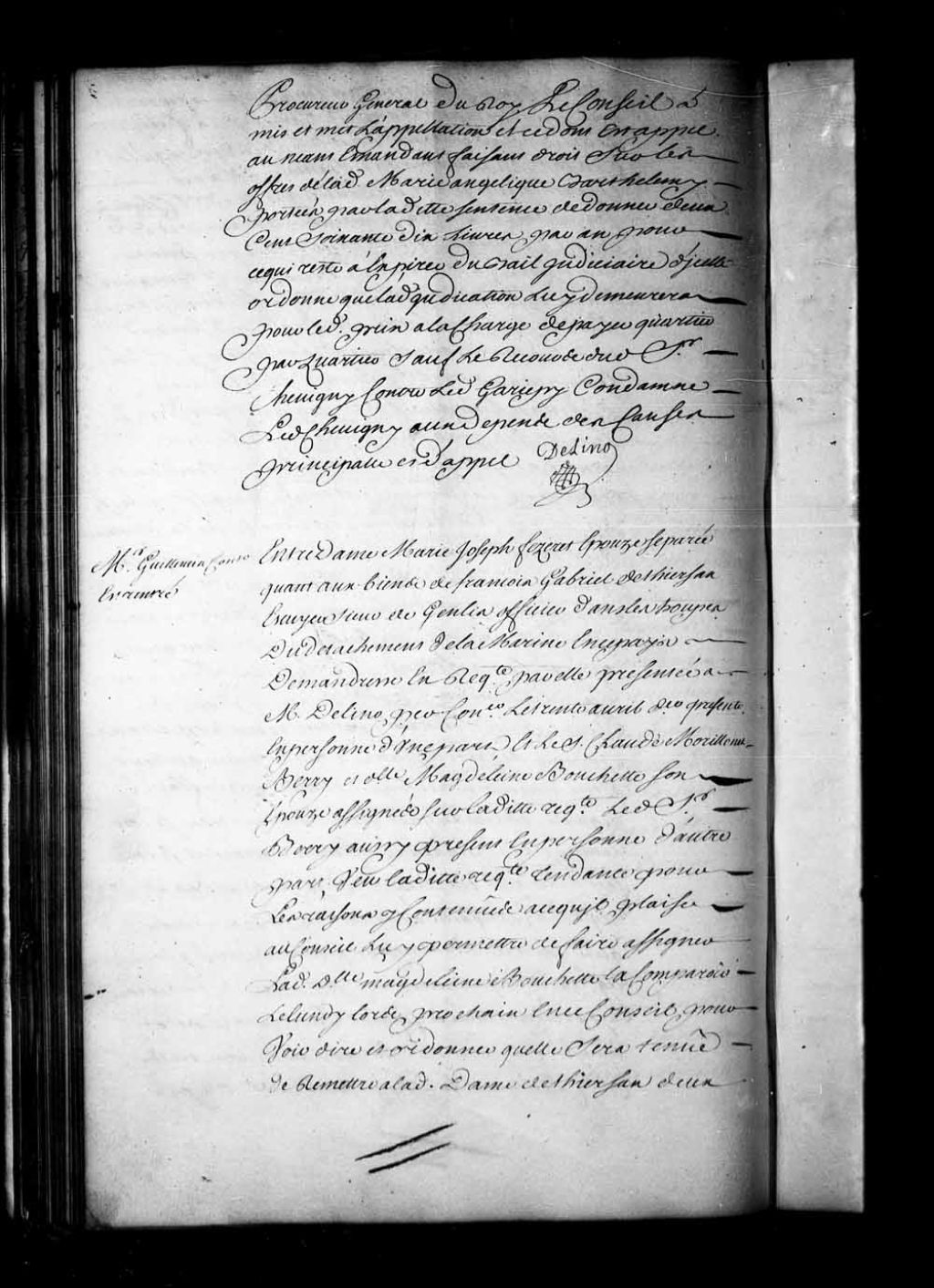 Arrêt qui donne acte à Claude Morillonnet Berry et Madeleine Bouchette, son épouse, de la remise faite sur le Bureau tant de billets que d'un portefeuille où s'est trouvé seulement une quittance de la somme de 600 livres, dans sa cause avec Dame Marie-Joseph Fezeret, épouse séparée quant aux biens de François-Gabriel de Thiersan, sieur de Genlis, officier dans les troupes, 9 mai 1729, Archives nationales à Québec, Fonds Conseil souverain, (03Q,TP1,S28,P16844).