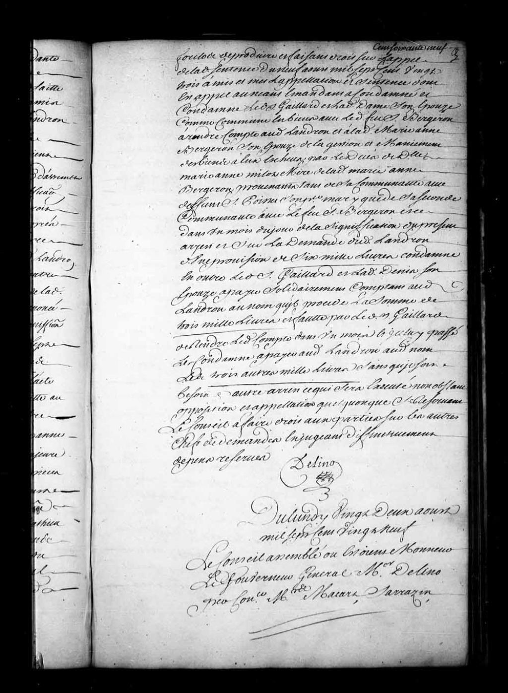 Appel mis à néant dans la cause entre Charles LeGardeur, écuyer, seigneur du fief de Bonsecours, officier dans les troupes, appelant de la sentence rendue en la Prévôté de Québec, le 29 mars 1729, et Joseph Duquet dit La Bazinière, habitant du dit fief. Il est ordonné que les procès-verbaux d'alignement faits par le sieur Dubocq, les 23 juin 1721 et 9 mars 1729, seront suivis et que le sieur Duquet sera tenu de fournir au dit sieur LeGardeur une grosse (copie) de son contrat de concession, 22 août 1729, Archives nationales à Québec, Fonds Conseil souverain, (03Q,TP1,S28,P16909).