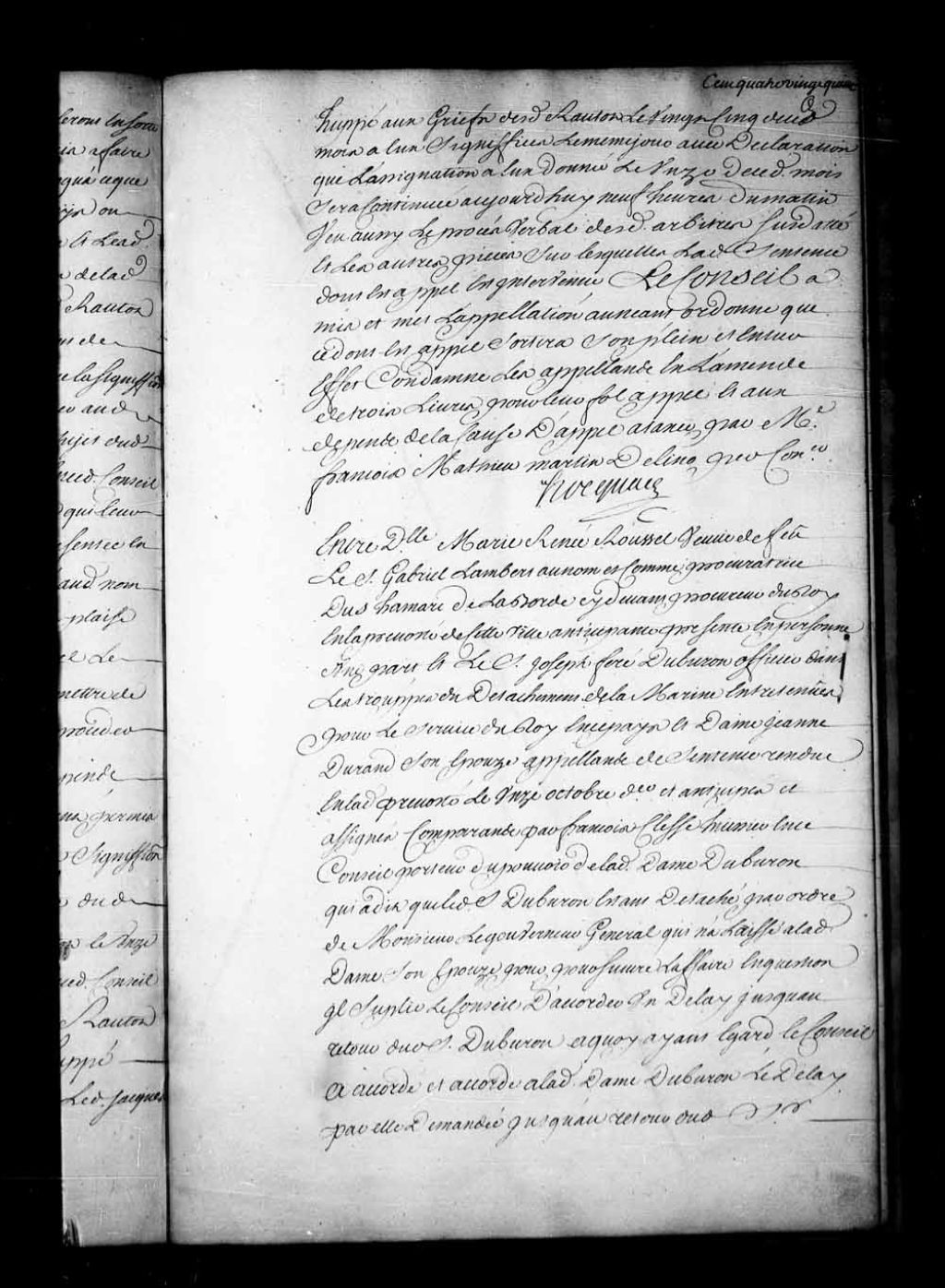 Arrêt qui accorde un délai à Joseph Féré DuBuron, officier dans les troupes de la Marine, absent pour le service du Roi, dans sa cause avec Marie-Renée Roussel, veuve de Gabriel Lambert, procuratrice du sieur Hamard de Laborde, procureur du Roi de la Prévôté de Québec, 28 novembre 1729, Archives nationales à Québec, Fonds Conseil souverain, (03Q,TP1,S28,P16962).