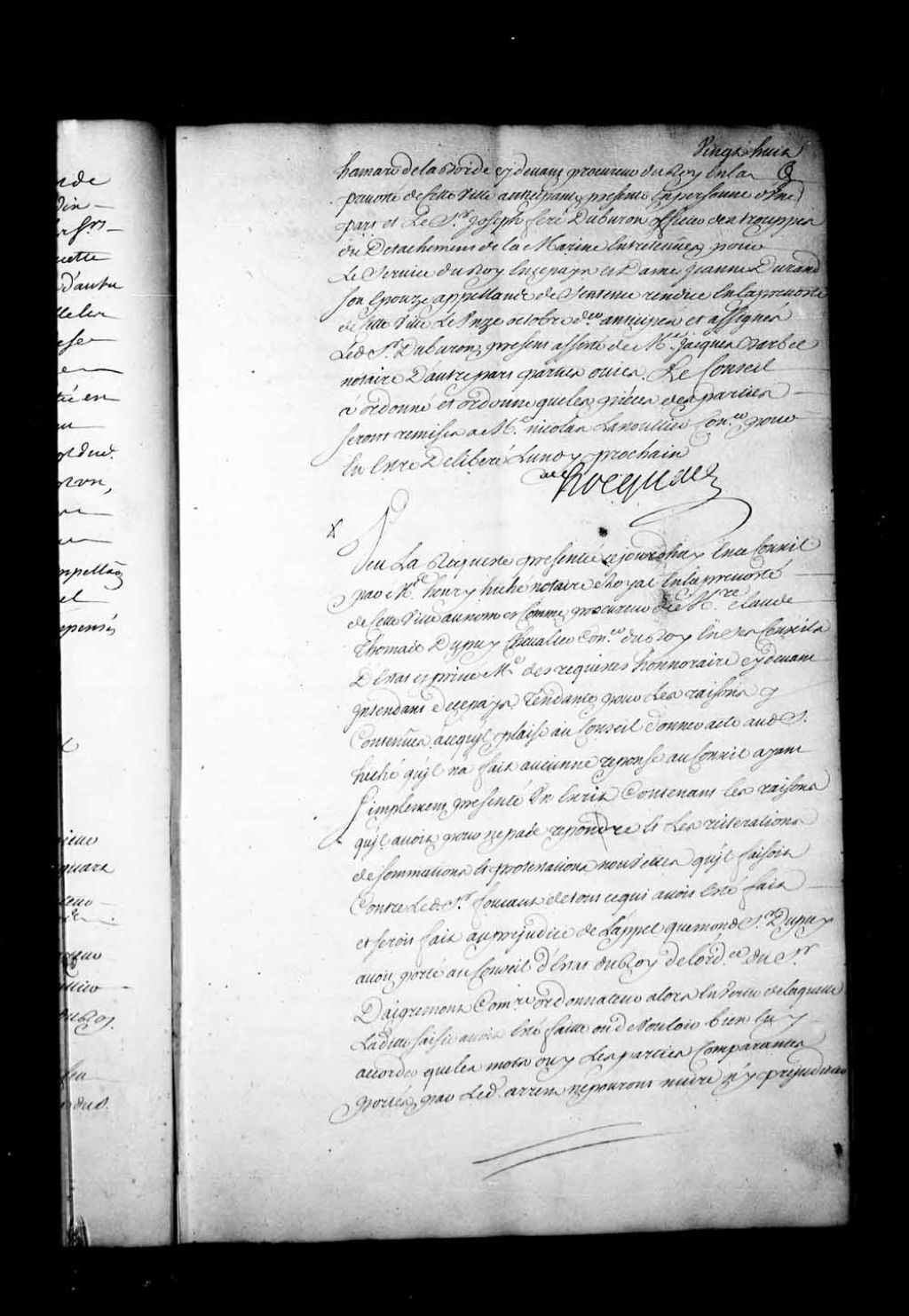 Arrêt qui met les parties hors de cour dans l'affaire entre Henri Hiché, notaire royal, procureur de Claude Dupuy, ancien intendant, et le sieur François Foucault, 13 mars 1730, Archives nationales à Québec, Fonds Conseil souverain, (03Q,TP1,S28,P17032).