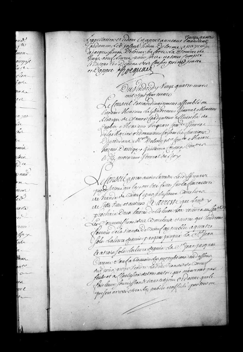 Arrêt qui décide que lundi prochain, deux heures de relevée, l'on recevra au Conseil les soumissions des bouchers et autres qui voudront fournir de la viande de boeuf au public à 4 sols la livre, depuis Pâques jusqu'à la Saint-Jean, et à 3 sols la livre, depuis la Saint-Jean jusqu'au carême, 24 mars 1730, Archives nationales à Québec, Fonds Conseil souverain, (03Q,TP1,S28,P17042).
