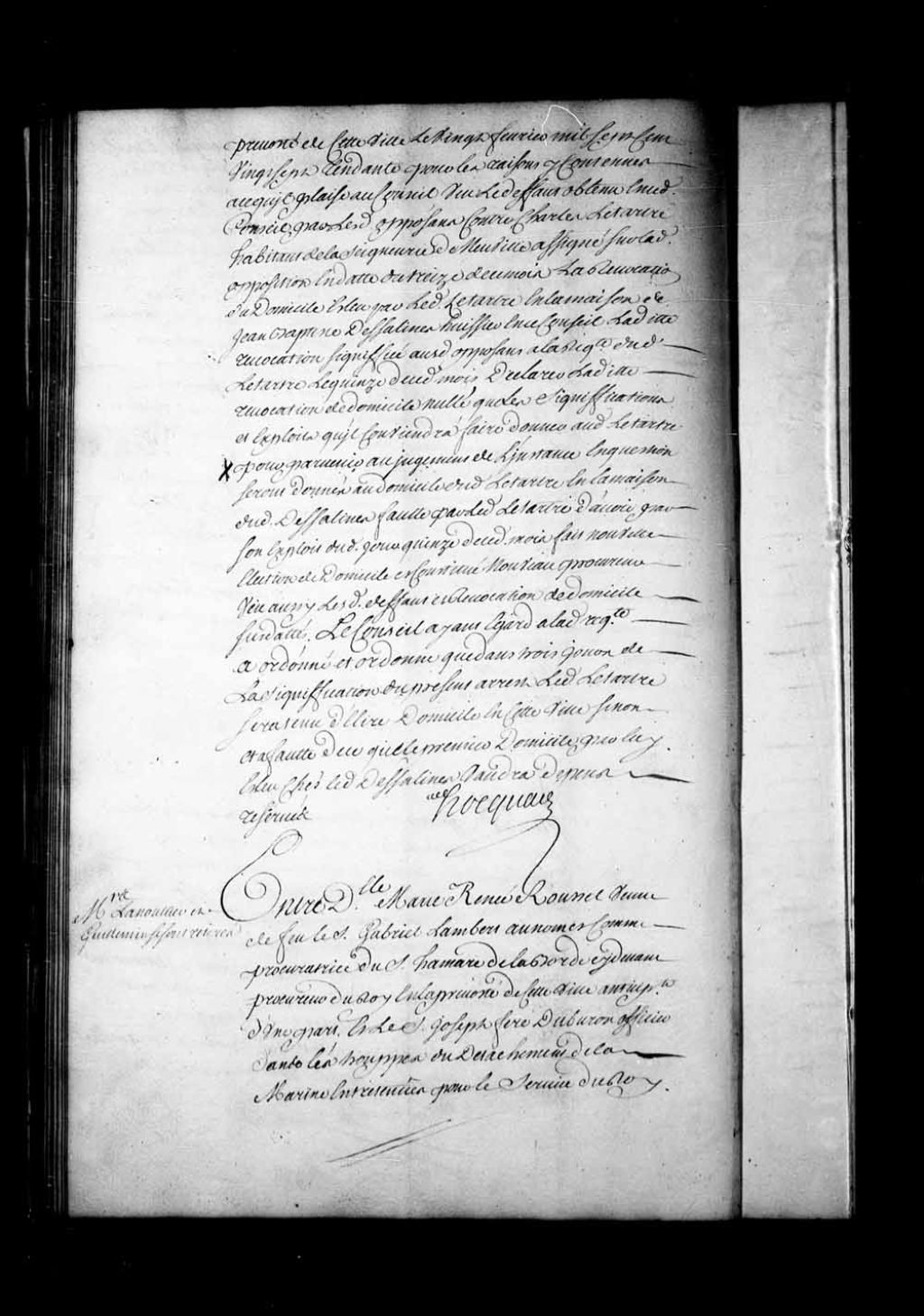 Appel mis à néant de la sentence rendue en la Prévôté de Québec, le 11 octobre 1729, dans l'affaire entre Marie-Renée Roussel, veuve de Gabriel Lambert, procuratrice du sieur Hamard de Laborde, et Joseph Feré DuBuron, officier dans les troupes, et Jeanne Durand, son épouse. DuBuron et son épouse sont condamnés à payer les 2000 livres qu'ils doivent au sieur de Laborde; toutefois il leur sera tenu compte de la somme de 700 livres comme dédommagement du terrain qui leur manque, 27 mars 1730, Archives nationales à Québec, Fonds Conseil souverain, (03Q,TP1,S28,P17049).
