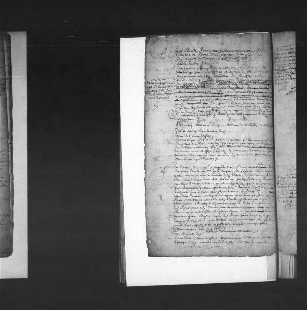 Transcription du texte avec orthographe modernisée : «Jean BOURDON ROMAINVILLE huissier au nom et comme procureur de Charles Courtois et Laurent Denis appelant d'une sentence donnée par le juge prévôt de Beaupré le 16e avril dernier Charles GAULTIER intimé. Parties ouïes après qu'elles ont comparu comme dit est et dit que pour éviter à frais et accélérer les formalités requises pour parvenir audit appel lesquelles sont fort préjudiciables à ceux qui sont éloignés, elles comparaissent de leur bon gré pour procéder sur ledit appel requérant lesdits appelants être reçus à leur appel et a en déduire les raisons, nous avons reçu lesdits appelants à leur appel et tenu ledit sieur Gautier pour bien intimé et en ce faisant les avons appointés en droit à écrire leurs griefs et réponses, dans trois jours, se communiquer trois jours après, et produire le tout avec les pièces sur lesquelles ladite sentence est intervenue autres trois jours après
