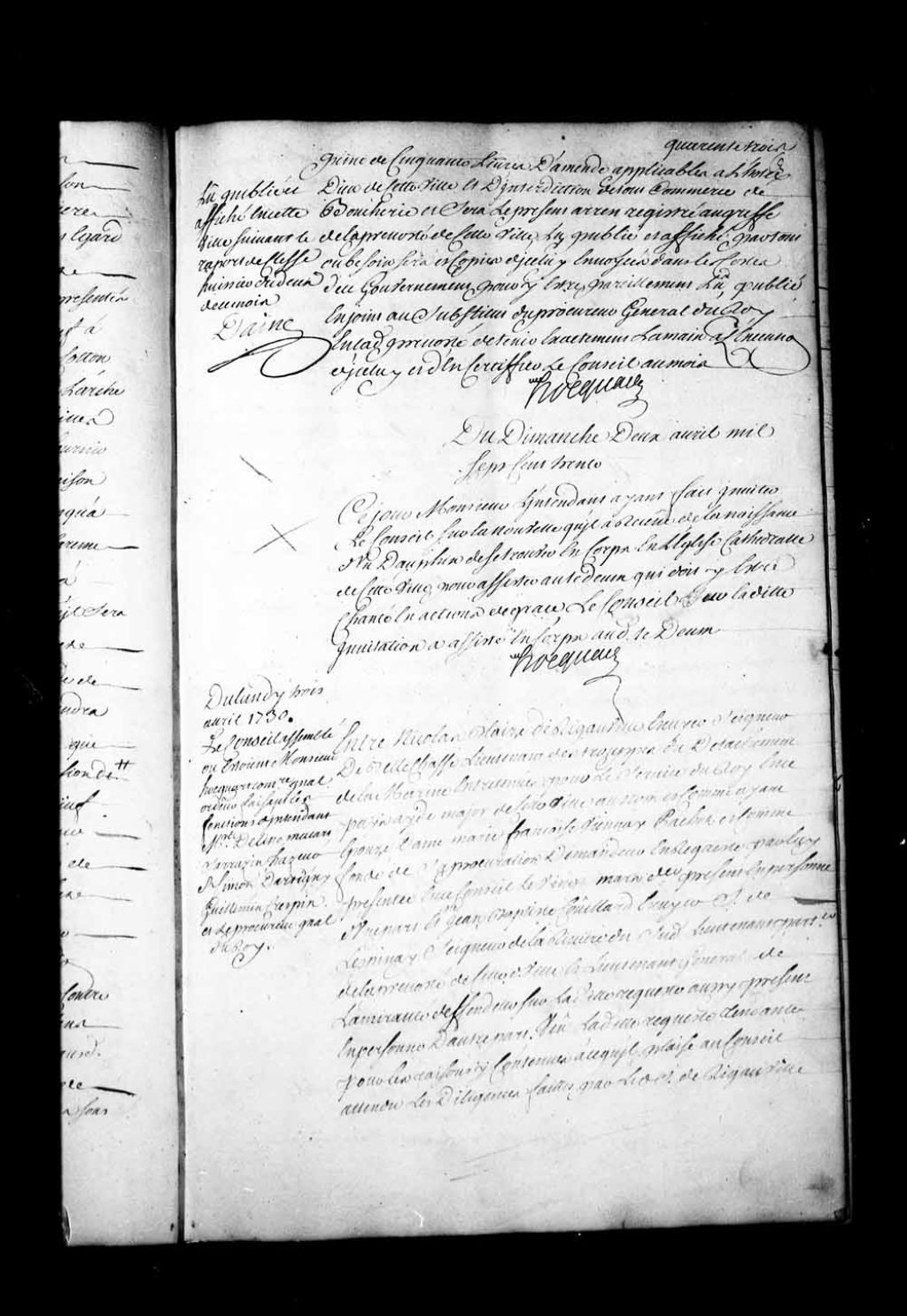 Arrêt qui, dans la cause entre Nicolas Blaise de Rigauville, seigneur de Bellechasse, et Jean-Baptiste Couillard de Lespinay, seigneur de la Rivière-du-Sud, ordonne de nommer un arpenteur pour mesurer et arpenter les concessions situées sur les bords de la rivière du Sud dans la seigneurie du sieur de Lespinay, 3 avril 1730, Archives nationales à Québec, Fonds Conseil souverain, (03Q,TP1,S28,P17052).