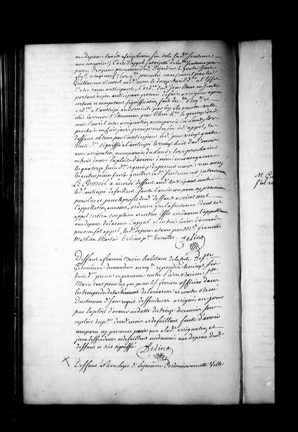 Arrêt qui accorde défaut à François Boivin, habitant de la côte Sainte-Geneviève (Ste-Geneviève), contre Pierre Racine dit Sainte-Marie (Ste-Marie), tant pour lui que pour le sieur Ferière, officier dans les troupes, et contre René Duchesneau dit Sansregret