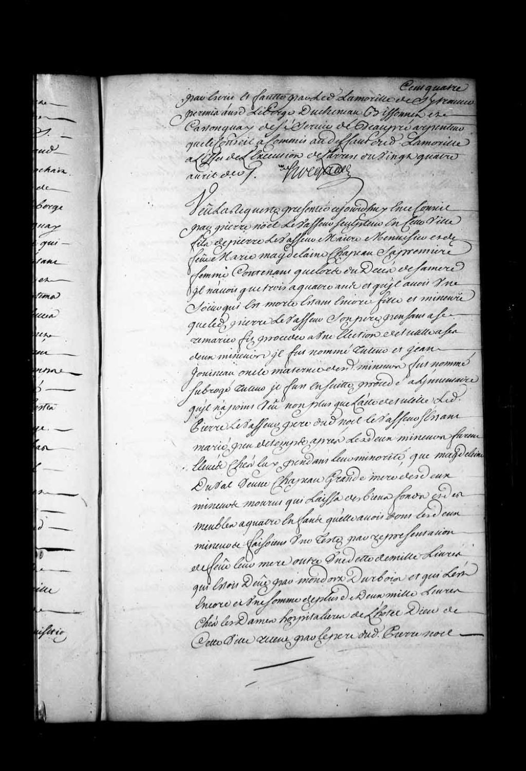 Arrêt qui ordonne d'expédier à Pierre-Noël Levasseur, sculpteur de Québec, fils de Pierre Levasseur, maître menuisier, et de feu Marie Madeleine Chapeau, sa première femme, lettres de rescision et restitution en entier contre un acte du 15 avril 1723, reçu par Dubreuil, qu'il a signé mais qui lui est dommageable, 28 août 1730, Archives nationales à Québec, Fonds Conseil souverain, (03Q,TP1,S28,P17135).