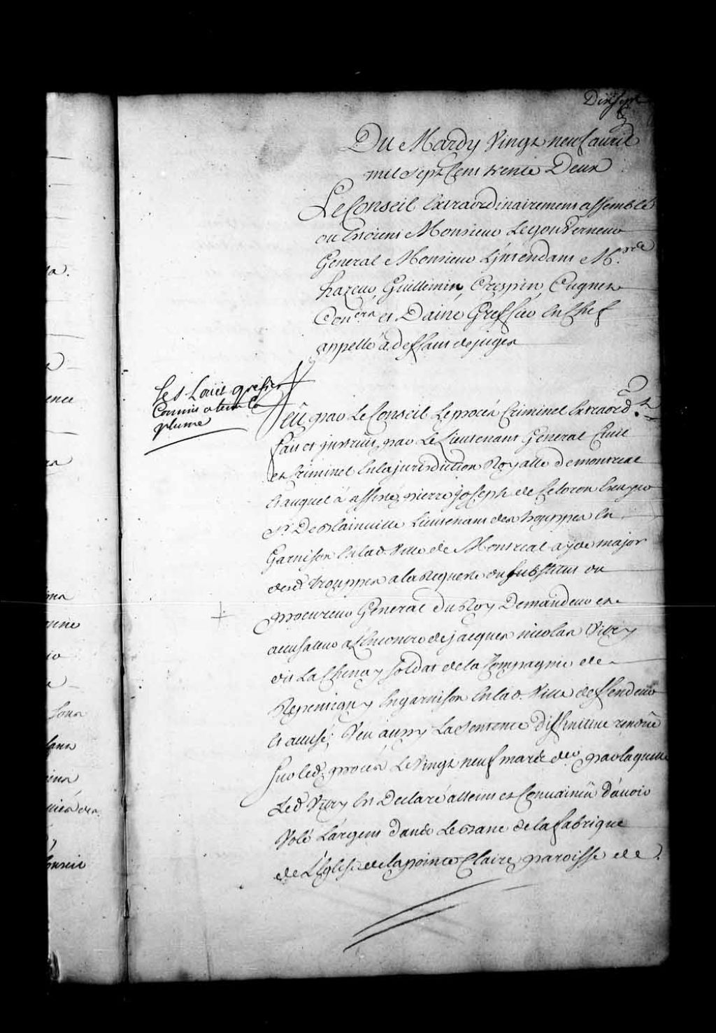 Appel mis à néant de la sentence rendue, le 29 mars 1732, dans la Juridiction de Montréal, contre Jacques-Nicolas Vitry dit Lachesnaye, prisonnier, soldat de la compagnie de Pierre Legardeur, sieur de Repentigny, en garnison à Montréal, accusé d'avoir volé de l'argent dans le banc de la fabrique de l'église de la Pointe-Claire, paroisse Saint-Joachim. Condamné à être battu, fustigé et marqué au fer de la fleur de lys de Sa Majesté à l'épaule droite et banni à perpétuité de la colonie