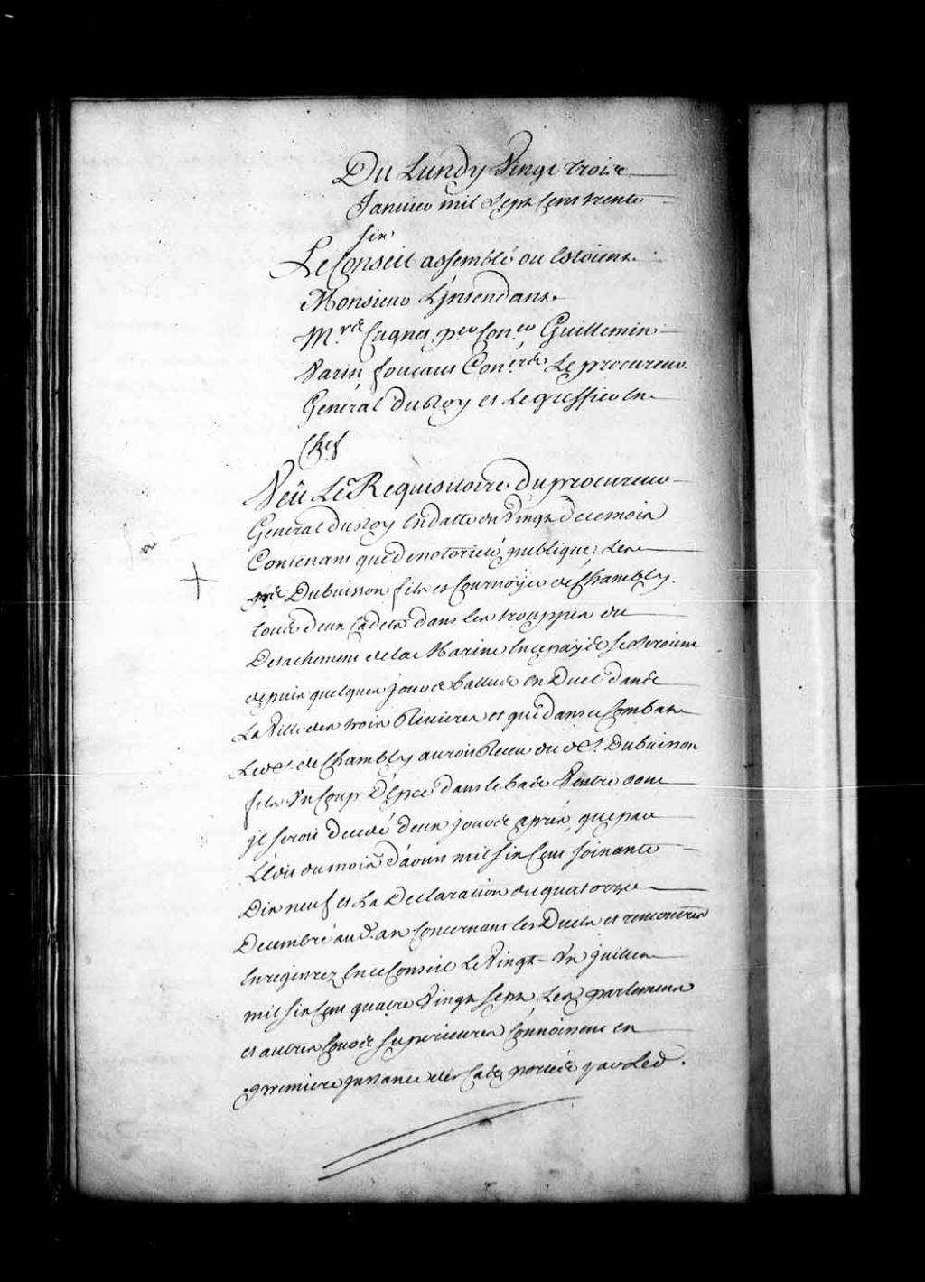 Réquisition du procureur-général du Roi, en date du 20 janvier, contre Charles Renaud, sieur de Dubuisson, accusé d'avoir tué d'un coup d'épée (duel) Charles Hertel, sieur de Chambly, de Cournoyer, cadet à l'aiguillette dans les troupes de la compagnie de Hertel, sieur de Cournoyer, en garnison à Trois-Rivières. Charles Renaud, sieur de Dubuisson, est condamné à se rendre à la prison royale des Trois-Rivières et répondre à la réquisition du procureur-général du Roi, 23 janvier 1736, Archives nationales à Québec, Fonds Conseil souverain, (03Q,TP1,S28,P17239).
