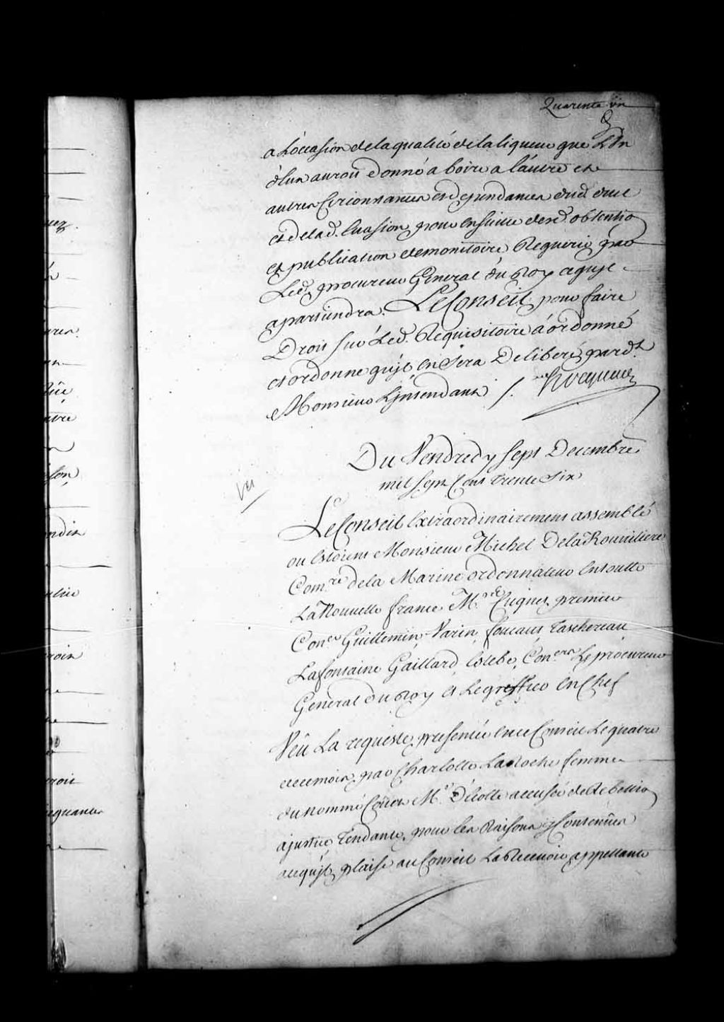 Arrêt du Conseil stipulant que Charlotte Laroche, femme du nommé Couet, maître d'école, est accusée de rébellion, le 4 décembre 1736, et est tenue de se présenter au lieutenant-général par assignation, sous peine de 2 livres d'amende, 7 décembre 1736, Archives nationales à Québec, Fonds Conseil souverain, (03Q,TP1,S28,P17242).