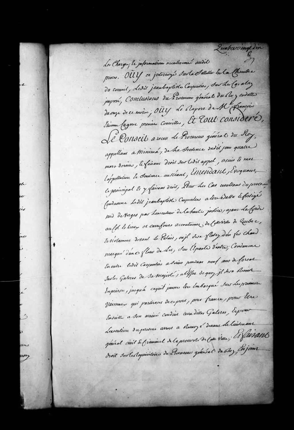 Appel mis à néant de la sentence rendue, le 30 mai 1747, contre Marie-Madeleine Bouin, femme de Paul Fleureau, boulanger, "absent de ce pays", prisonnière, accusée d'avoir "celé, couvert et occulté sa grossesse et son enfantement (infanticide). Elle est condamnée à être battue et fustigée nue sur la place publique de la ville de Québec, marquée de la fleur de lys sur l'épaule droite et bannie à perpétuité de la colonie, 12 juin 1747, Archives nationales à Québec, Fonds Conseil souverain, (03Q,TP1,S28,P17274).