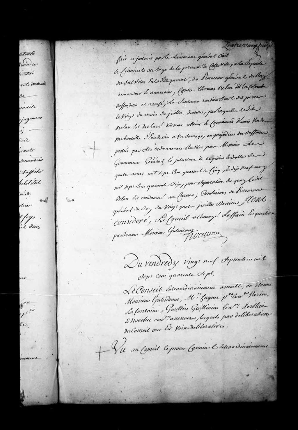 Appel mis au néant de la sentence rendue, le 12 août 1747, contre Guillaume-Jacques Wouters dit Duchâteau, Charles Enard dit Tranchemontagne, Jean-Baptiste LeRoy dit Saint-Jean, Jean Bouffard dit Saint-Médard, soldats en la garnison de la ville de Montréal, et Marie-Anne Cardinal, femme du dit Bouffard. Guillaume-Jacques Wouters est accusé d'avoir fabriqué 7 fausses ordonnances (monnaie) intitulées : «Marine 1745» et signées Hocquart. Wouters est condamné à être battu et fustigé nu sur la place publique de la ville de Montréal, marqué au fer de la fleur de lys sur l'épaule droite et servir sur les galères du Roi pour une période de 9 années. Pour avoir distribué les fausses ordonnances, Enard et LeRoy sont condamnés à être battus et fustigés nus sur la place publique de la ville de Montréal, marqués au fer de la fleur de lys sur l'épaule droite et servir sur les galères du Roi pour une période de 3 années. Pour leur part, Jean Bouffard dit Saint-Médard et Marie-Anne Cardinal, femme du dit Bouffard, sont absous de toutes accusations, 29 septembre 1747, Archives nationales à Québec, Fonds Conseil souverain, (03Q,TP1,S28,P17276).