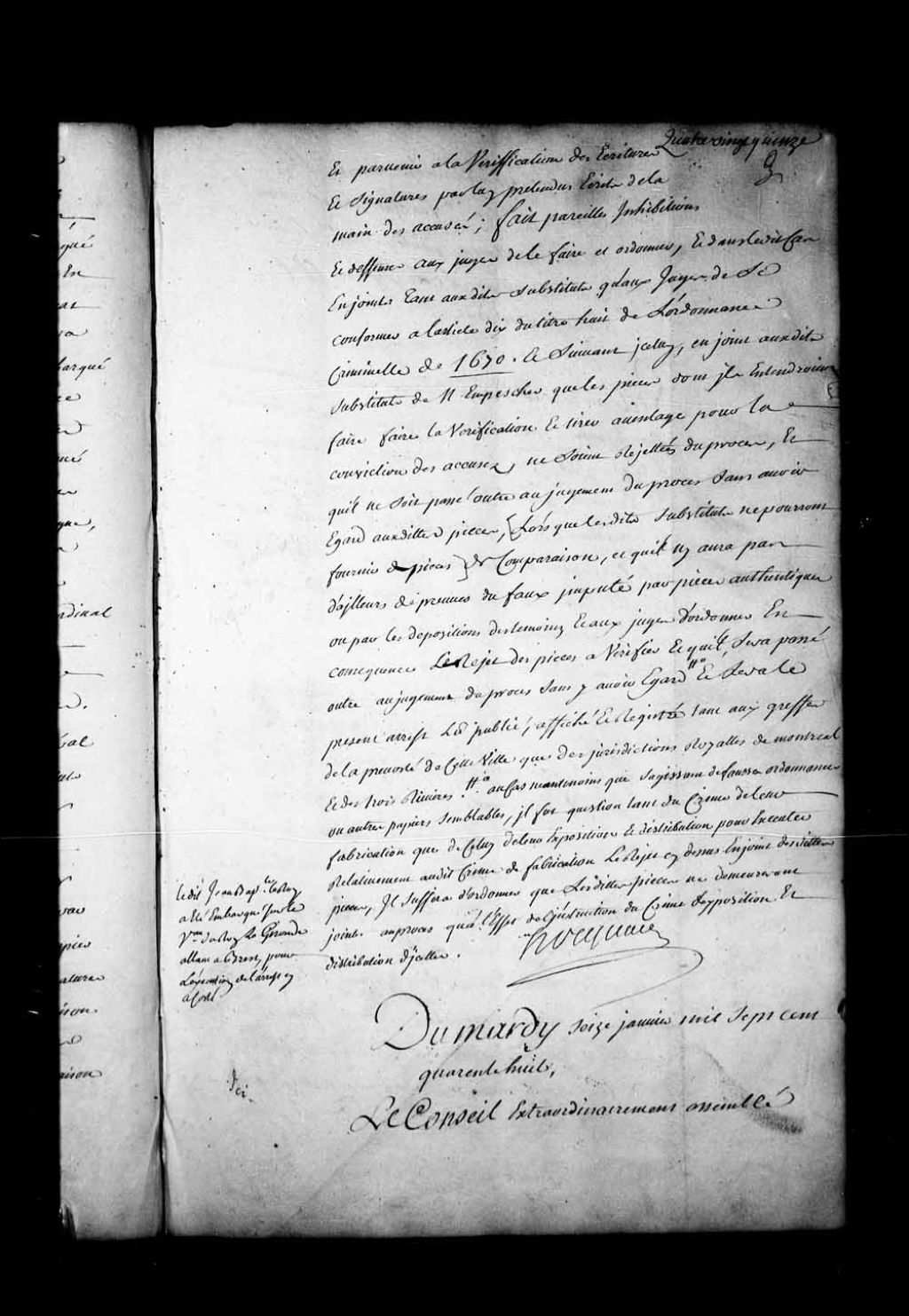 Appel à néant de la sentence rendue, le 13 décembre 1747, contre Pierre Denis dit Lyonnais, tambour dans la compagnie de Cabanac, accusé de vols de nuit, et Jacques Barbier et Marie-Jeanne Laroche, femme de Pierre Denis dit Tourangeau, accusé d'avoir recelé les objets volés par Pierre Denis dit Lyonnais, et contre Jean LeFort dit Villeneuve, accusé d'avoir volé des papiers dans les poches de Pierre Denis dit Lyonnais. Ce dernier est condamné à être battu et fustigé, marqué au fer de la fleur de lys à l'épaule droite, à porter un écriteau mentionnant : «Voleur de nuit» et envoyé aux galères pour une période de 9 années. Les accusations contre Jean LeFort dit Villeneuve sont abandonnées, 16 janvier 1748, Archives nationales à Québec, Fonds Conseil souverain, (03Q,TP1,S28,P17277).