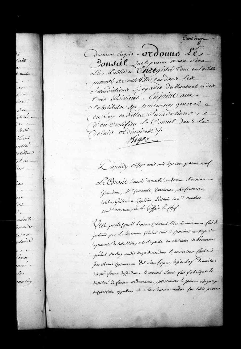 Arrêt du Conseil contre Jean-Louis Gannereau dit Sansfaçon et Jean-Baptiste LeMaître dit «Piedferme», accusés, le 27 mars 1749, d'avoir fabriqué et distribué de fausses ordonnances (monnaie) et condamnés à être pendus