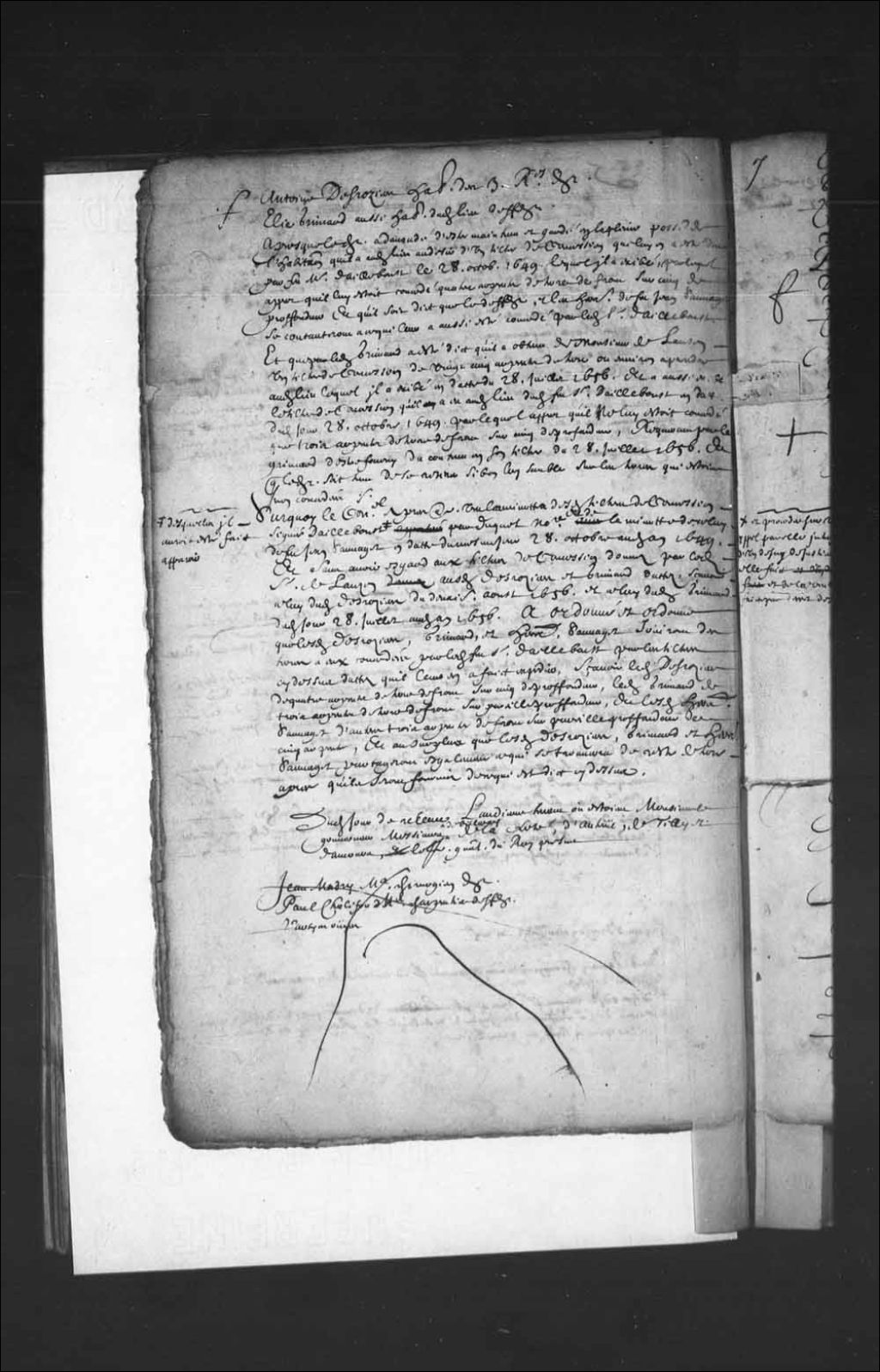 - Transcription du texte avec orthographe modernisée : «Aujourd'hui 30e juillet 1664 est comparue au greffe du Conseil souverain à Québec Marguerite Hayot femme de Médard Chouart Desgroyseliers laquelle a dit en conséquence d'une requête par elle présentée et répondue par le Conseil le cinquième de ce mois voulant au désir d'icelle faire intimer le nommé Jean Peré au nom et comme procureur de Arnaud Peré son frère pour comparaître audit Conseil et procéder sur un appel par elle interjeté d'un déni de justice à elle fait et de la vente faite par décret de ses biens, ledit Peré la voyant sur le point de partir pour descendre des Trois-Rivières en cette ville il la fut trouver et lui dît en présence de témoins qu'il n'était pas de besoin de le faire assigner et qu'il descendrait aussi par la première commodité qui se présenterait ensuite, que cependant ledit Peré la voyant partir a laissé passer plusieurs commodités et a dit qu'il se moquait de cela et qu'il ne descendrait pas Prétendant par la ennuyer ladite Hayot et la réduire à l'impossible, pourquoi elle proteste à l'encontre de lui des frais de son voyage et de tous dépens dommages et intérêts dont elle a requis acte, à elle octroyé et a signé.»