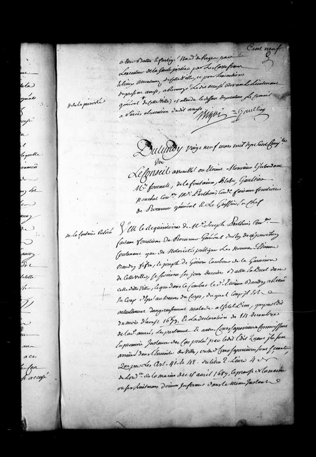 Arrêt du Conseil ordonnant que Étienne Baudry, soldat fifre de la compagnie de François Lefebvre, sieur Duplessis, en garnison à Québec, et de Joseph de Gouire, tambour de la garnison de Québec, accusés de s'être battus en duel, soient interrogés sur ce crime, 29 mars 1751, Archives nationales à Québec, Fonds Conseil souverain, (03Q,TP1,S28,P17290).