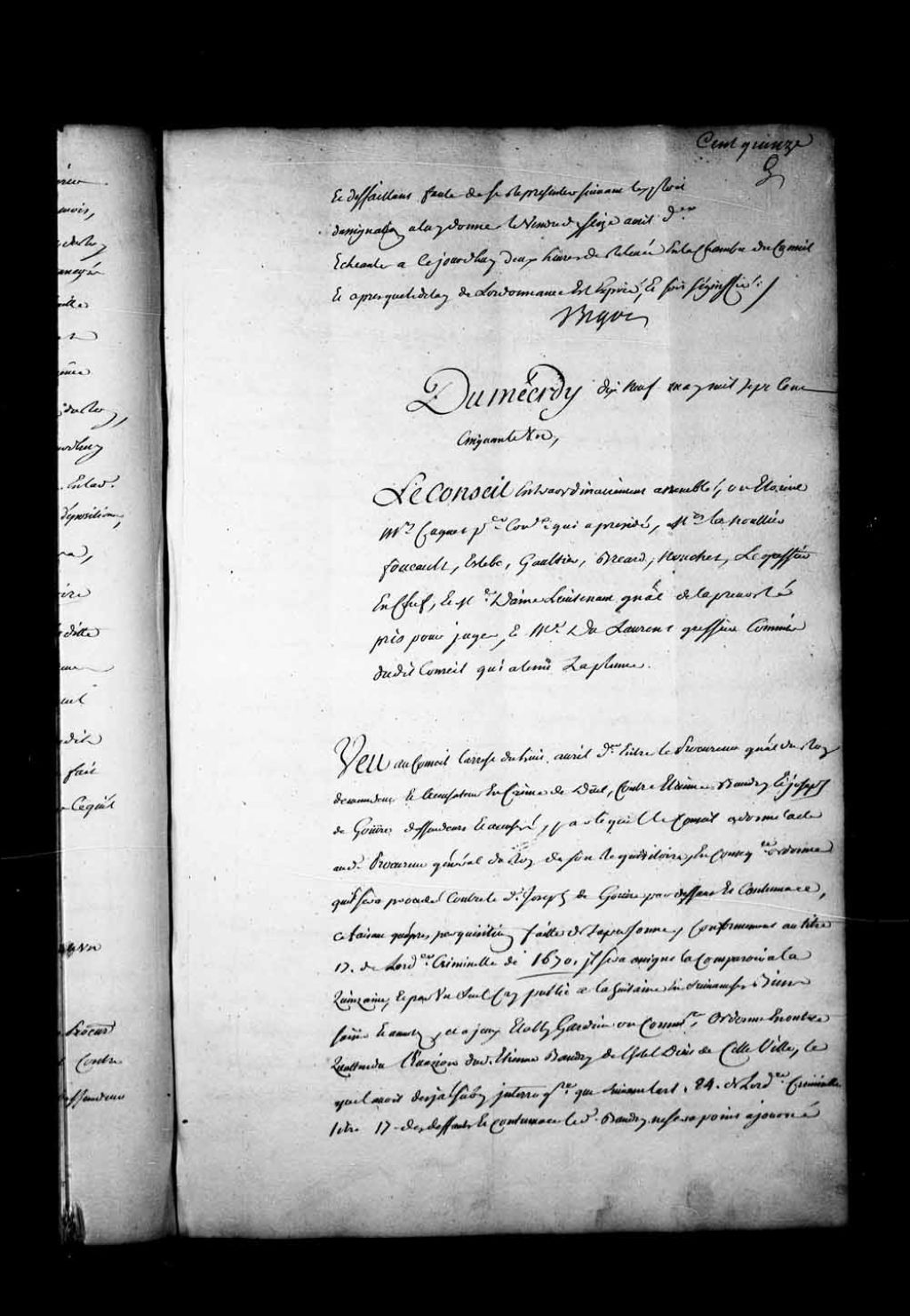Assignation à comparaître à la quinzaine (15 jours) contre Joseph de Gouire et que le procès criminel contre Étienne Baudry soit continué. De plus, arrêt du Conseil ordonnant le recollement des témoins et des informations du 31 mars 1751 pour confrontation avec les accusés, 19 mai 1751, Archives nationales à Québec, Fonds Conseil souverain, (03Q,TP1,S28,P17299).