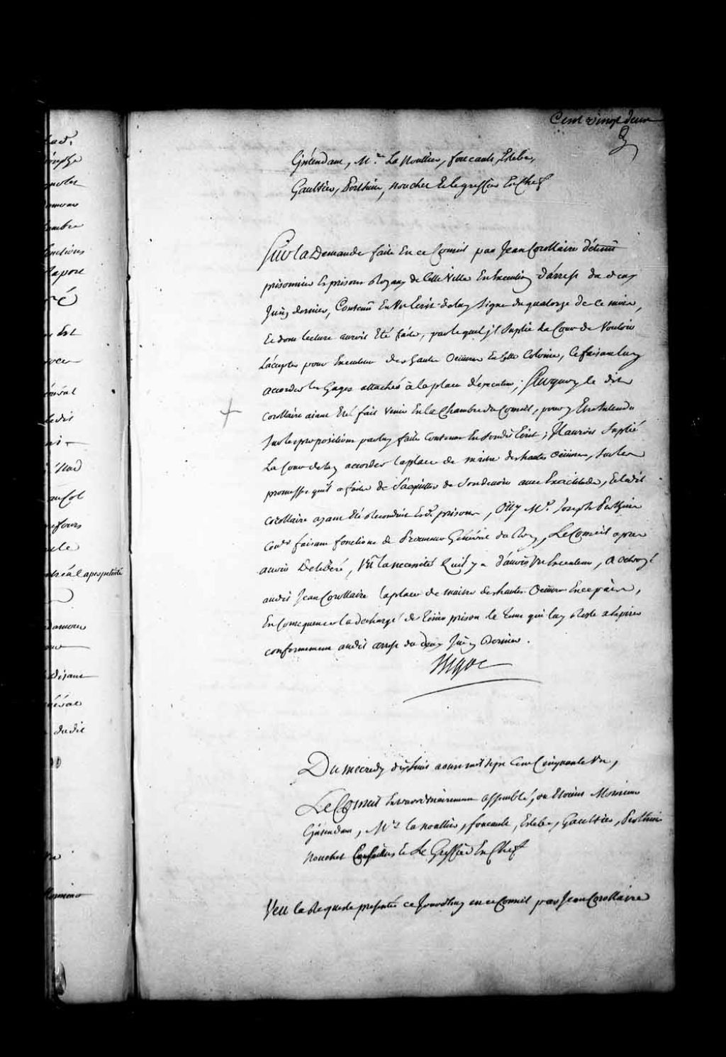 Arrêt du Conseil déchargeant Françoise Laurent, de la sentence rendue le 12 mars 1751, à condition qu'elle épouse Jean Corollaire, maître des hautes oeuvres (bourreau), 18 août 1751, Archives nationales à Québec, Fonds Conseil souverain, (03Q,TP1,S28,P17306).