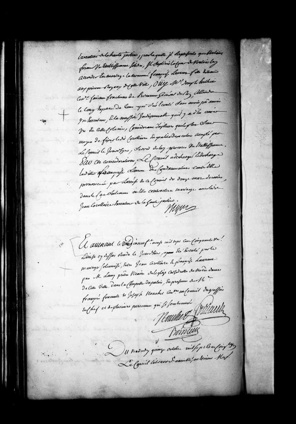 Arrêt du Conseil mentionnant le mariage de Jean Corollaire, maître des hautes oeuvres (bourreau), et Françoise Laurent, prisonnière, en la cathédrale de Notre-Dame en la chapelle du palais