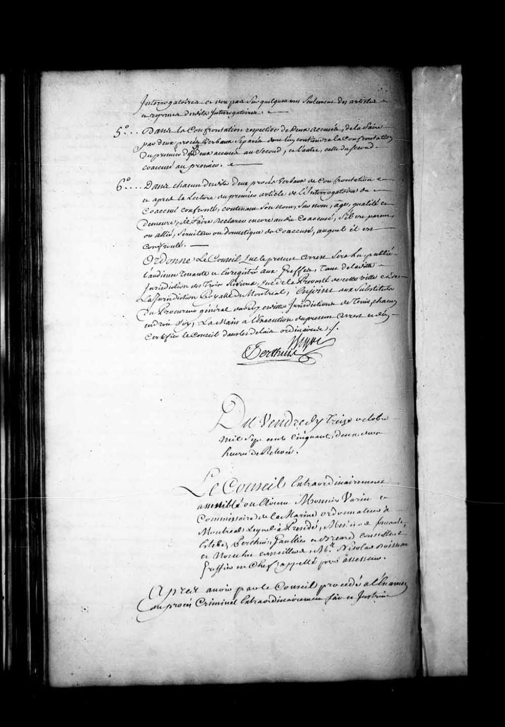 Arrêt qui remet à demain, sept heures du matin, le jugement dans le procès criminel fait et instruit par le lieutenant-général de la Prévôté de Québec contre Pierre-Victor Reverd, soldat de la compagnie de Fonville, Joseph-François Collette, caporal de la compagnie de Saint-Pierre et Guillaume Le Goffe, engagé au poste des Sept-Îles