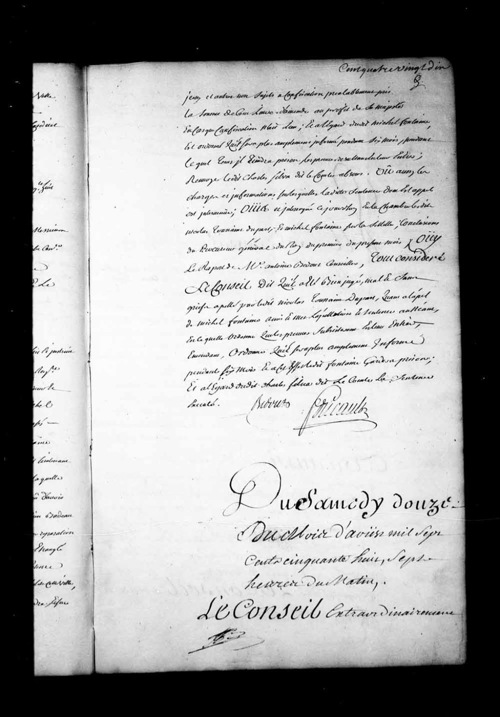 Appel mis à néant de la sentence rendue, le 14 juillet 1758, contre Jean Roy dit Leroy, tambour de la compagnie de Raymond, accusé d'avoir distribué une fausse ordonnance de 24 livres (monnaie). Roy est banni à perpétuité de la Nouvelle-France. De plus, défense au lieutenant général de la Juridiction des Trois-Rivières d'entendre le dénonciateur comme témoin, 12 août 1758, Archives nationales à Québec, Fonds Conseil souverain, (03Q,TP1,S28,P17390).