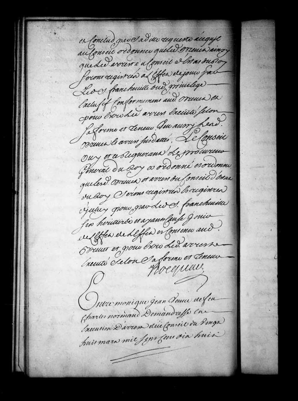 Arrêt dans la cause entre Monique Jean, veuve de Charles Normand, demanderesse en exécution d'arrêt du 28 mars 1718, et défenderesse, assistée de Jacques Larcher dit Parisien, tailleur d'habits à Québec, d'une part, et Geneviève Liénard, veuve de Jean-François Grégoire, tant en son nom que comme tutrice de ses enfants, défenderesse et demanderesse en requête présentée par elle en ce Conseil, le 26 janvier dernier. Le Conseil, sans avoir égard à la requête de la dite Grégoire, ordonne que sur les 333 livres, 6 sols, 8 deniers, restant du douaire de Marie Pelletier accordée à elle, par son contrat de mariage avec Denis Jean, elle paiera à la dite Monique Jean la somme de 104 livres, 3 sols, 4 deniers, savoir celle de 20 livres, 16 sols, 8 deniers, pour le quart à elle revenant du dit douaire, comme héritière d'Ignace Jean, et celle de 83 livres, 6 sols, 8 deniers, comme étant aux droits et cessionnaire de Nicolas Denis, sauf à faire droit pour le surplus des autres parts du dit douaire revenant à Louis, Joseph et Ignace Jean, cohéritiers, lorsqu'ils se présenteront, 12 mars 1731, Archives nationales à Québec, Fonds Conseil souverain, (03Q,TP1,S28,P17407).