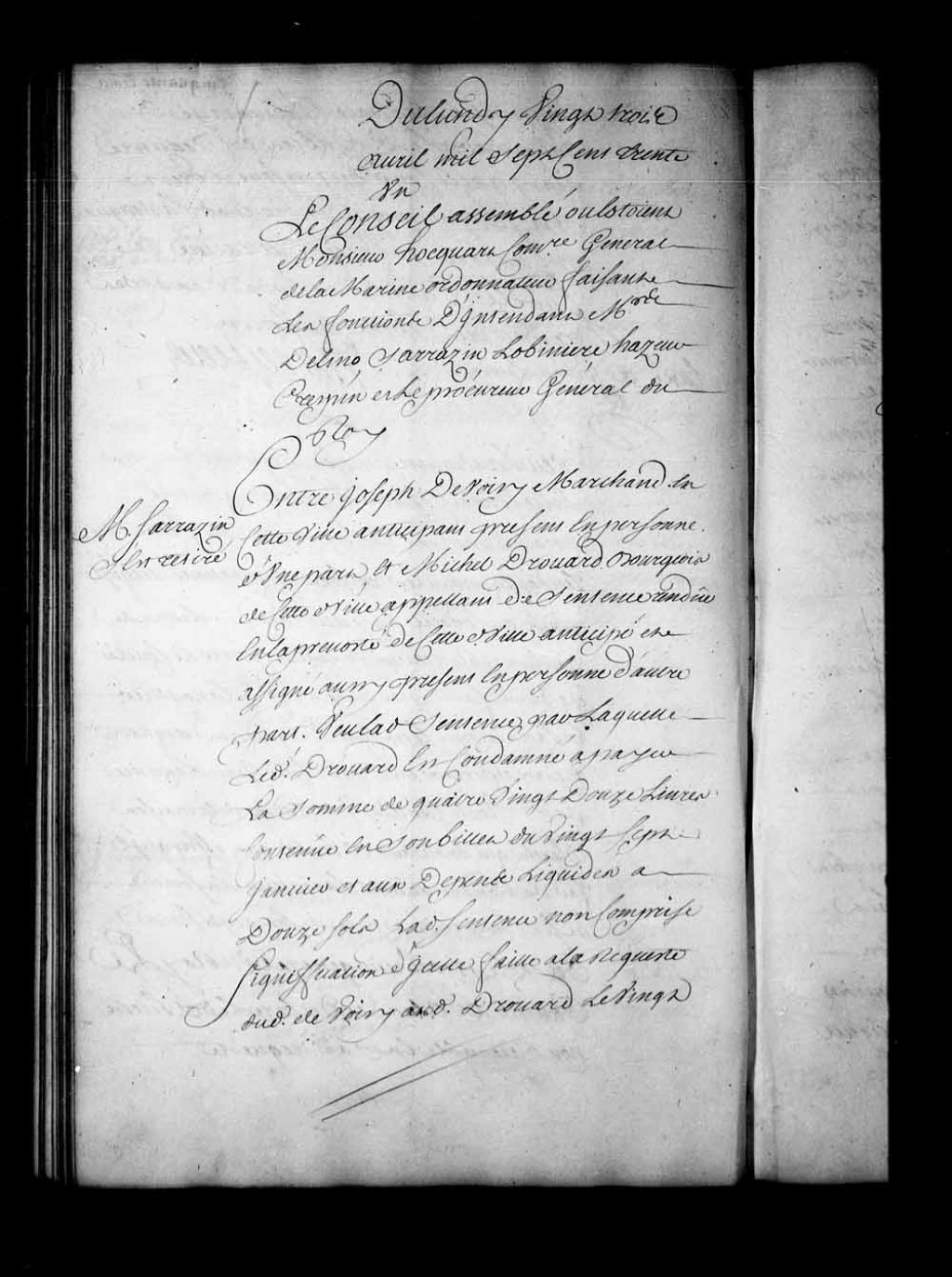 Appel mis à néant de la sentence rendue en la Prévôté de Québec dans la cause entre Joseph de Voisy, marchand à Québec, et Michel Drouard, bourgeois de Québec. Il est ordonné que la sentence sortira son plein et entier effet, sauf au dit Drouard à se pourvoir pour le mur mitoyen en contestation, ainsi qu'il avisera, 23 avril 1731, Archives nationales à Québec, Fonds Conseil souverain, (03Q,TP1,S28,P17426).