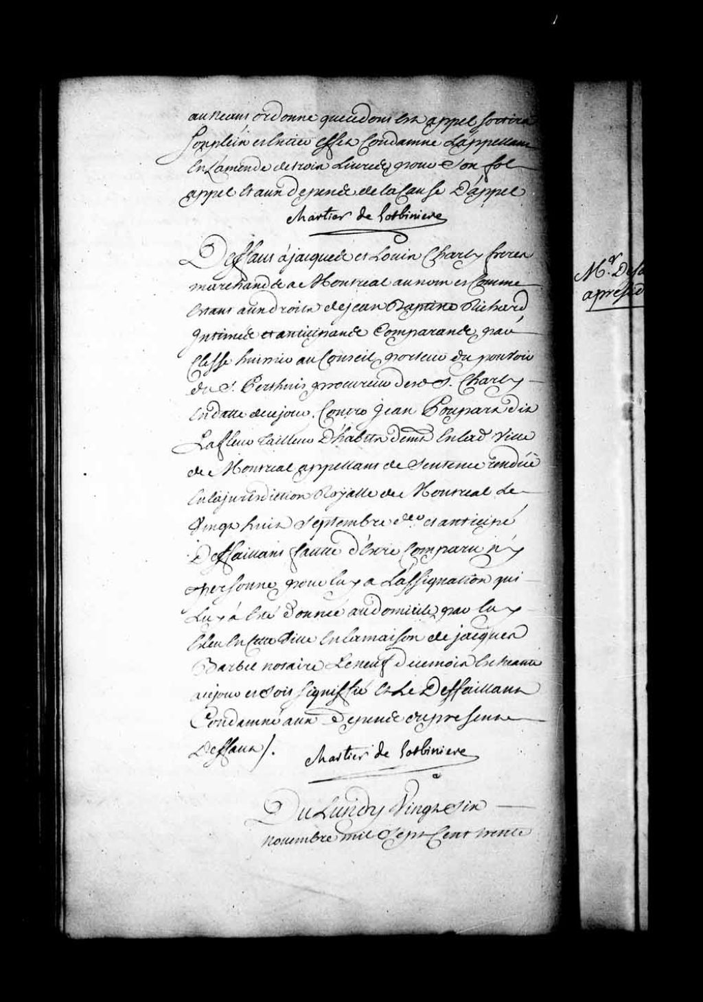 Arrêt qui accorde défaut à Jacques et Louis Charly, frères, marchands à Montréal, au nom et comme étant aux droits de Jean-Baptiste Richard, contre Jean Poupart dit Lafleur, tailleur d'habits de Montréal et appelant de la sentence rendue en la Juridiction de Montréal, le 28 septembre 1731