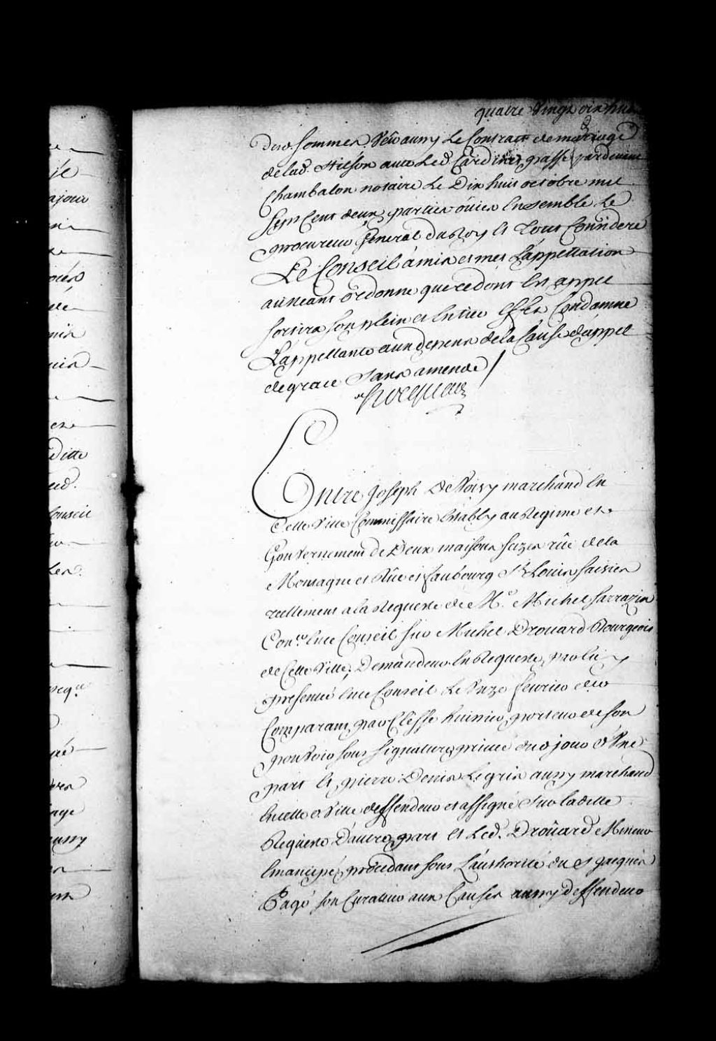 Arrêt qui ordonne qu'il sera procédé et passé outre au bail judiciaire de la maison en contestation, dans la cause entre Joseph de Voisy, marchand, commissaire établi au régime et gouvernement de deux maisons, situées rue de la Montagne et faubourg Saint-Louis, saisies à la requête de Michel Sarrazin sur Michel Drouard, et Pierre Denis Legris, marchand à Québec, 28 avril 1732, Archives nationales à Québec, Fonds Conseil souverain, (03Q,TP1,S28,P17605).