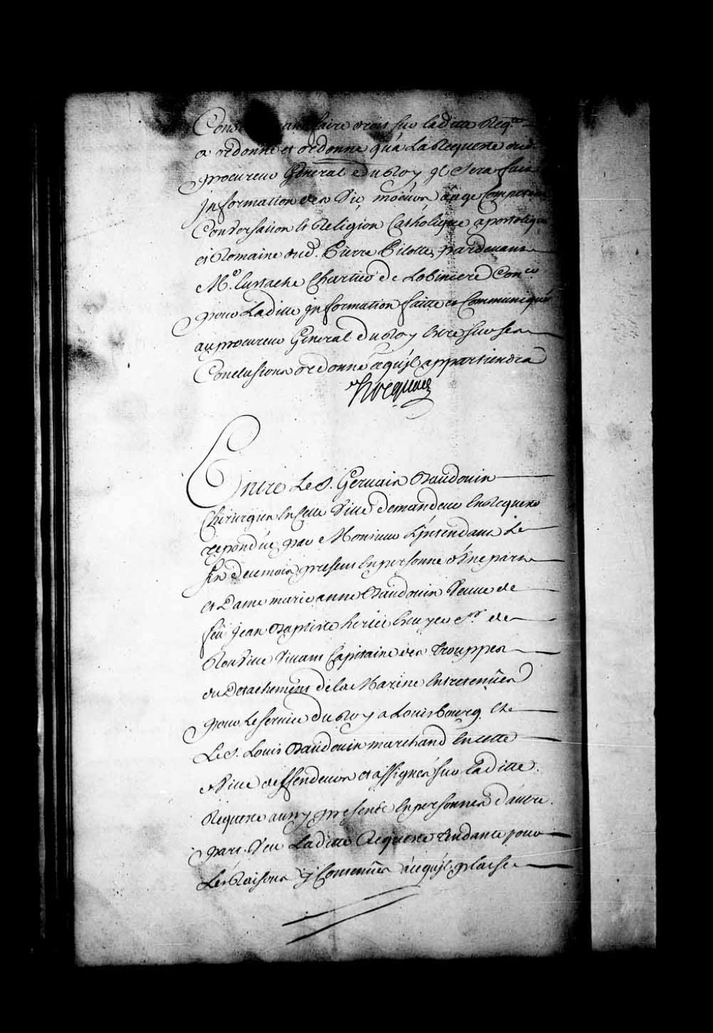 Arrêt qui, avant de faire droit sur la requête du sieur Gervais Beaudoin, ordonne que les procès-verbaux de partage en question seront communiqués au Procureur général du Roi dans l'affaire entre Gervais Beaudoin, chirurgien à Québec, et dame Marie-Anne Beaudoin, veuve de Jean-Baptiste Hertel de Rouville, capitaine des troupes à Louisbourg, et le sieur Louis Beaudoin, marchand à Québec, défendeurs, 12 mai 1732, Archives nationales à Québec, Fonds Conseil souverain, (03Q,TP1,S28,P17613).