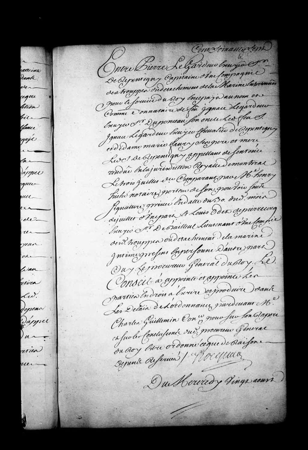 Appel mis à néant de la sentence rendue en l'Amirauté de Québec, le 23 octobre 1728, dans la cause entre Joseph Fleury de la Gorgendière, agent de la Compagnie des Indes en ce pays, et Charles Campagna, navigateur, 20 août 1732, Archives nationales à Québec, Fonds Conseil souverain, (03Q,TP1,S28,P17663).