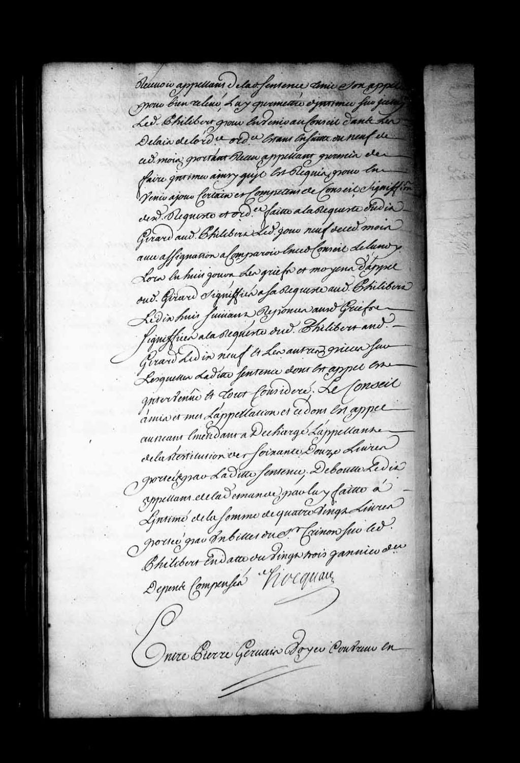 Appel mis à néant de la sentence rendue en la Prévôté de Québec, le 1er juillet 1732, et le sieur Fornel, marchand de Québec, dans la cause entre Pierre Gervais Voyer, couvreur. Le Conseil condamne Fornel à payer à Voyer la somme de 110 livres pour la couverture qu'il a faite à la maison du dit Fornel, suivant le toisé représenté par lui, montant à 73 toises, 21 pieds, 6 pouces, 20 août 1732, Archives nationales à Québec, Fonds Conseil souverain, (03Q,TP1,S28,P17668).