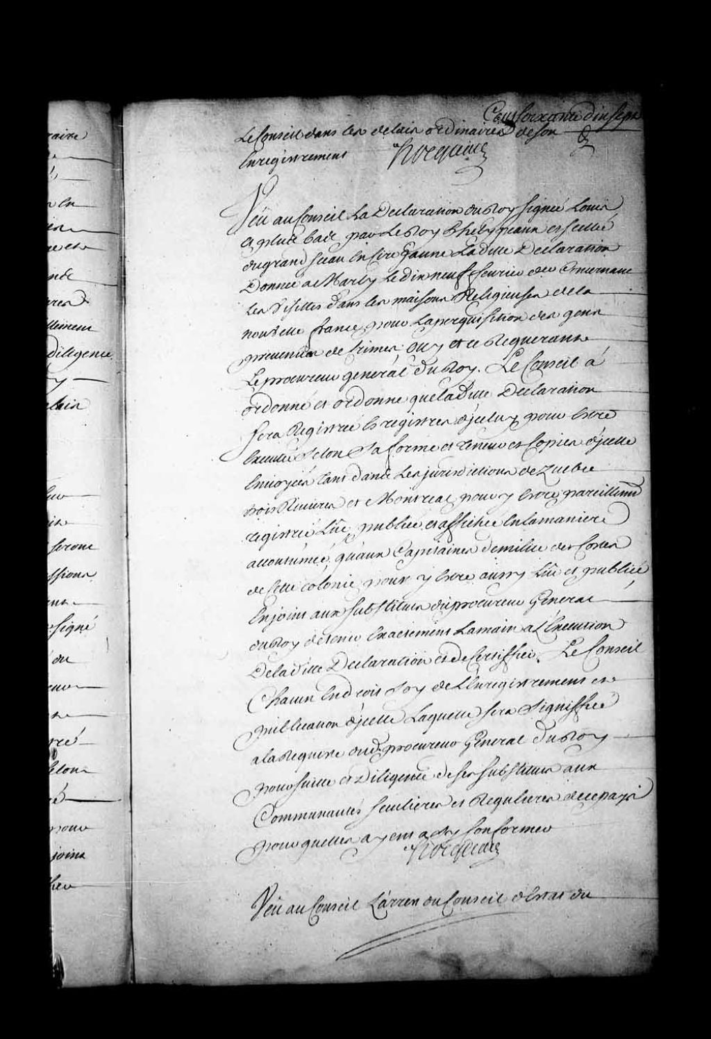 Arrêt qui ordonne d'enregistrer la déclaration du Roi, au sujet des visites dans les maisons religieuses de la Nouvelle-France pour la perquisition des gens prévenus de crimes