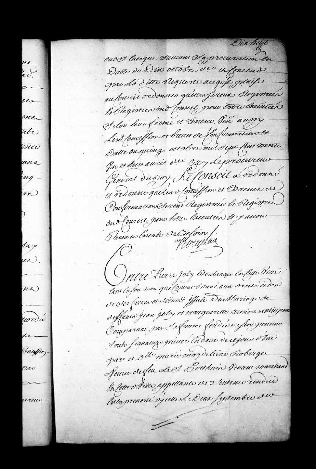 Arrêt qui ordonne, avant de faire droit, que l'appelante donnera communication au sieur Joly de la sentence rendue en la Prévôté de Québec, le 15 mars 1700, dans la cause entre Pierre Joly, boulanger, tant en son nom que comme étant aux droits cédés de ses frères et soeurs, issus du mariage de feu Jean Joly et de Marguerite Amyot, contre Marie-Madeleine Roberge, veuve du sieur Perthuis, marchand de Québec, appelante de la sentence rendue en la Prévôté de Québec, le 2 septembre 1732, 17 novembre 1732, Archives nationales à Québec, Fonds Conseil souverain, (03Q,TP1,S28,P17709).